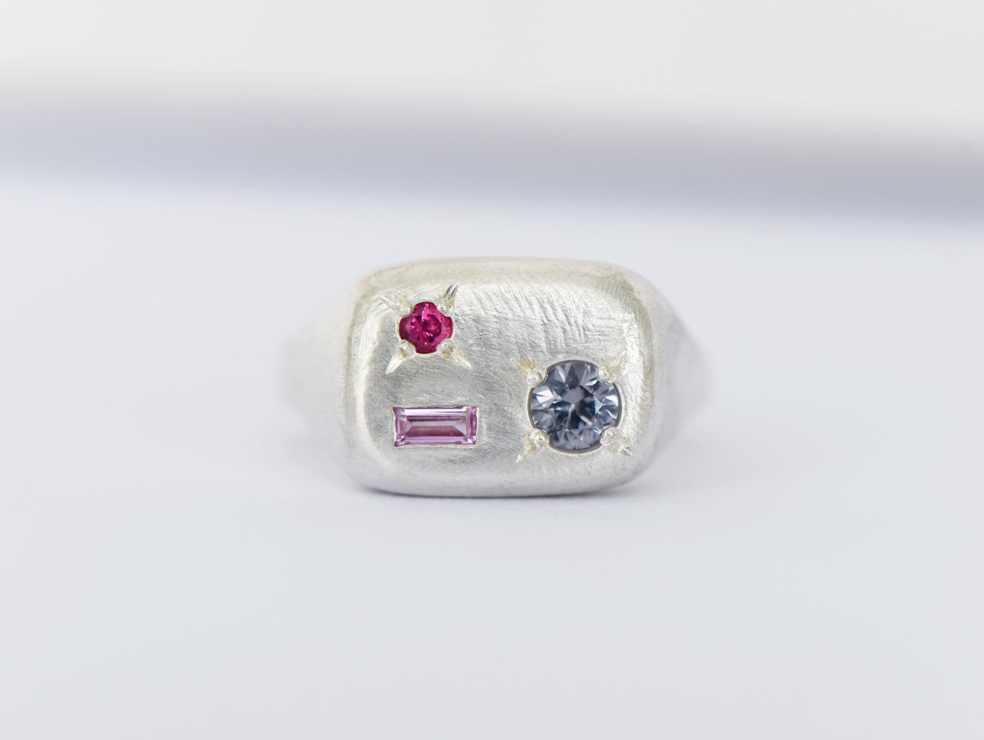 Bulbous ring made from stones sourced from Bangkok. Rounded oblong face, negative space, rounded band and SB hallmarking at rear.