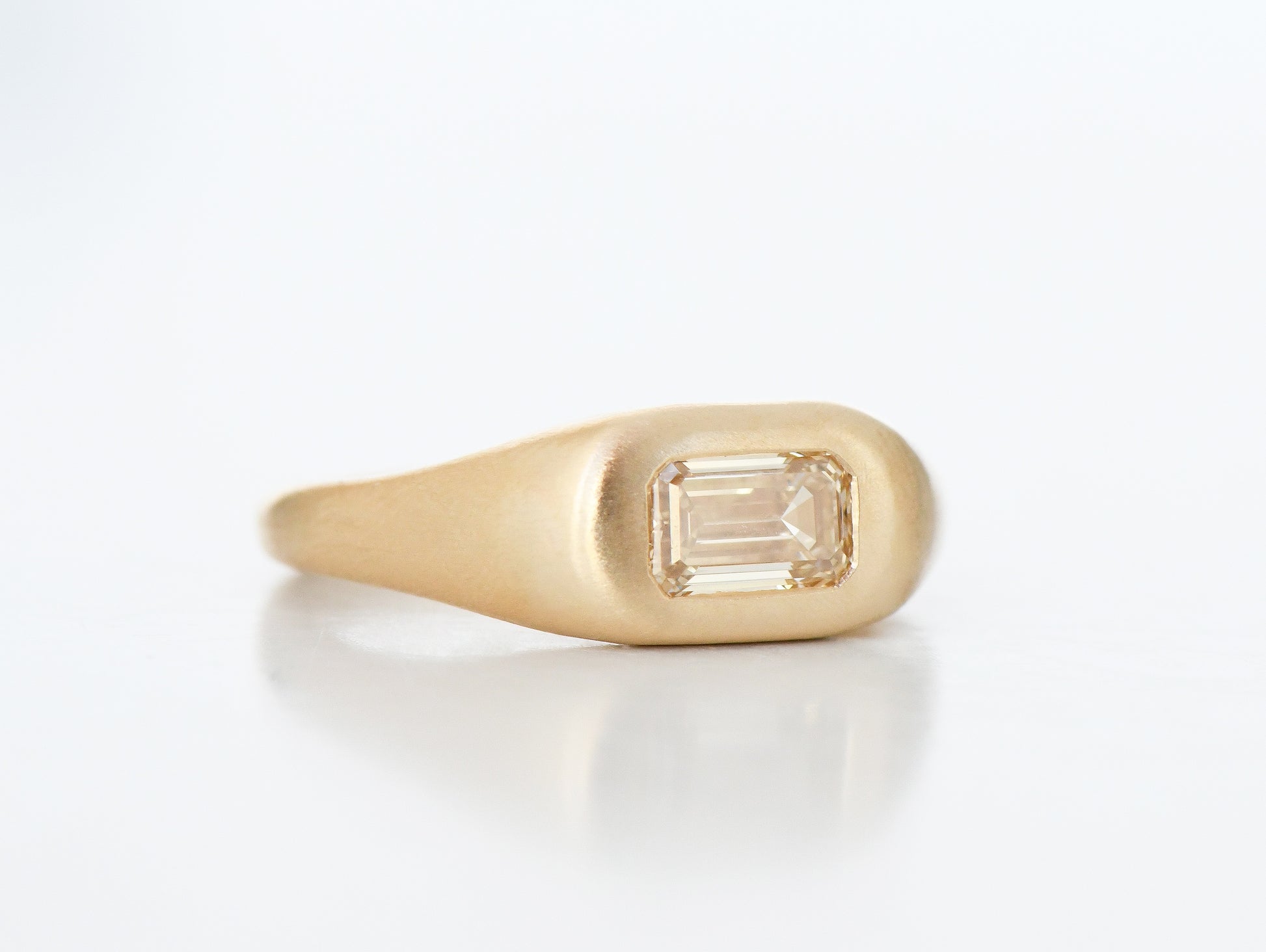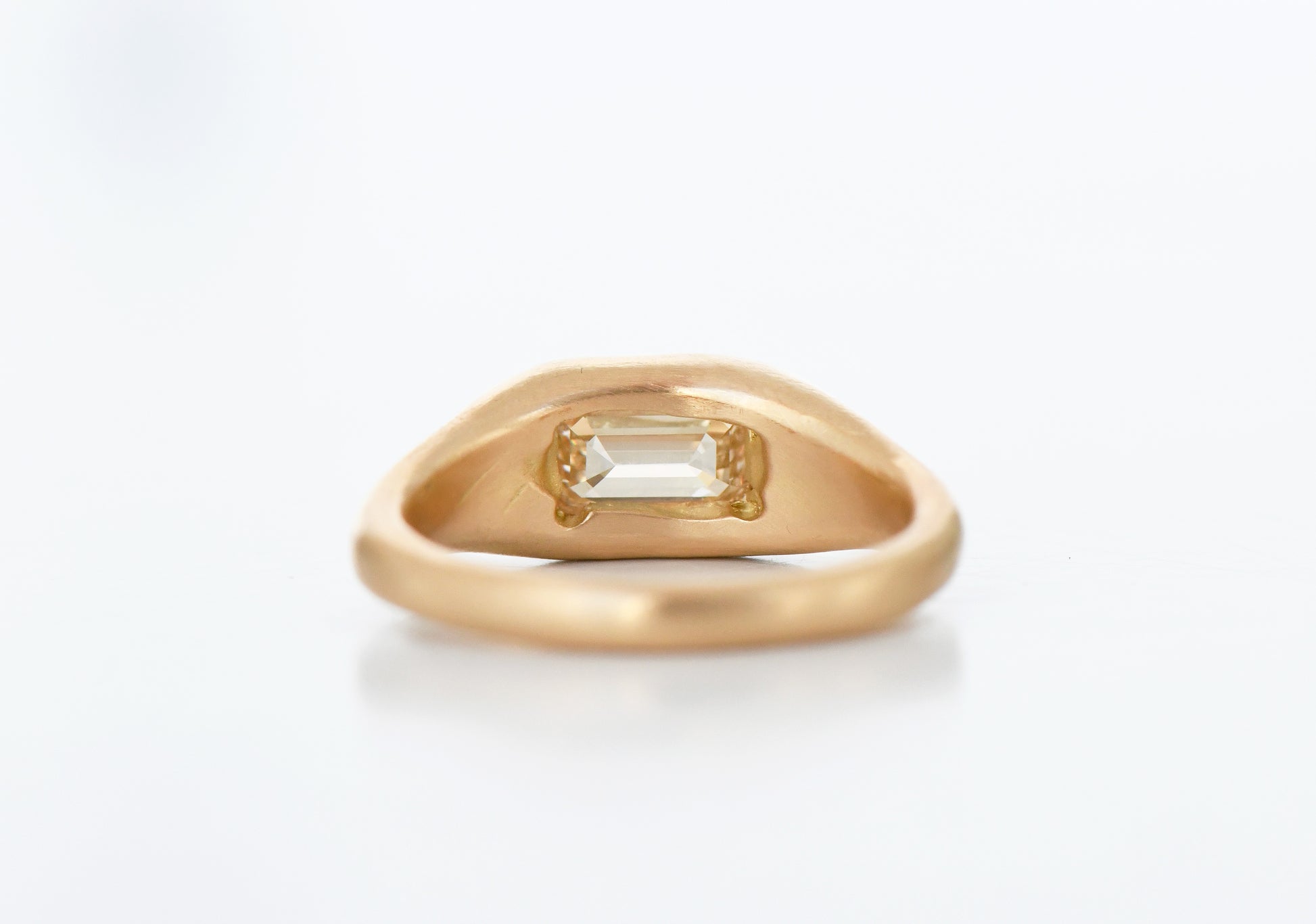 A rounded ring flush set with a geometric emerald cut diamond. Bulbous band, tapered shoulders, rounded smooth band and SB hallmarking at rear.