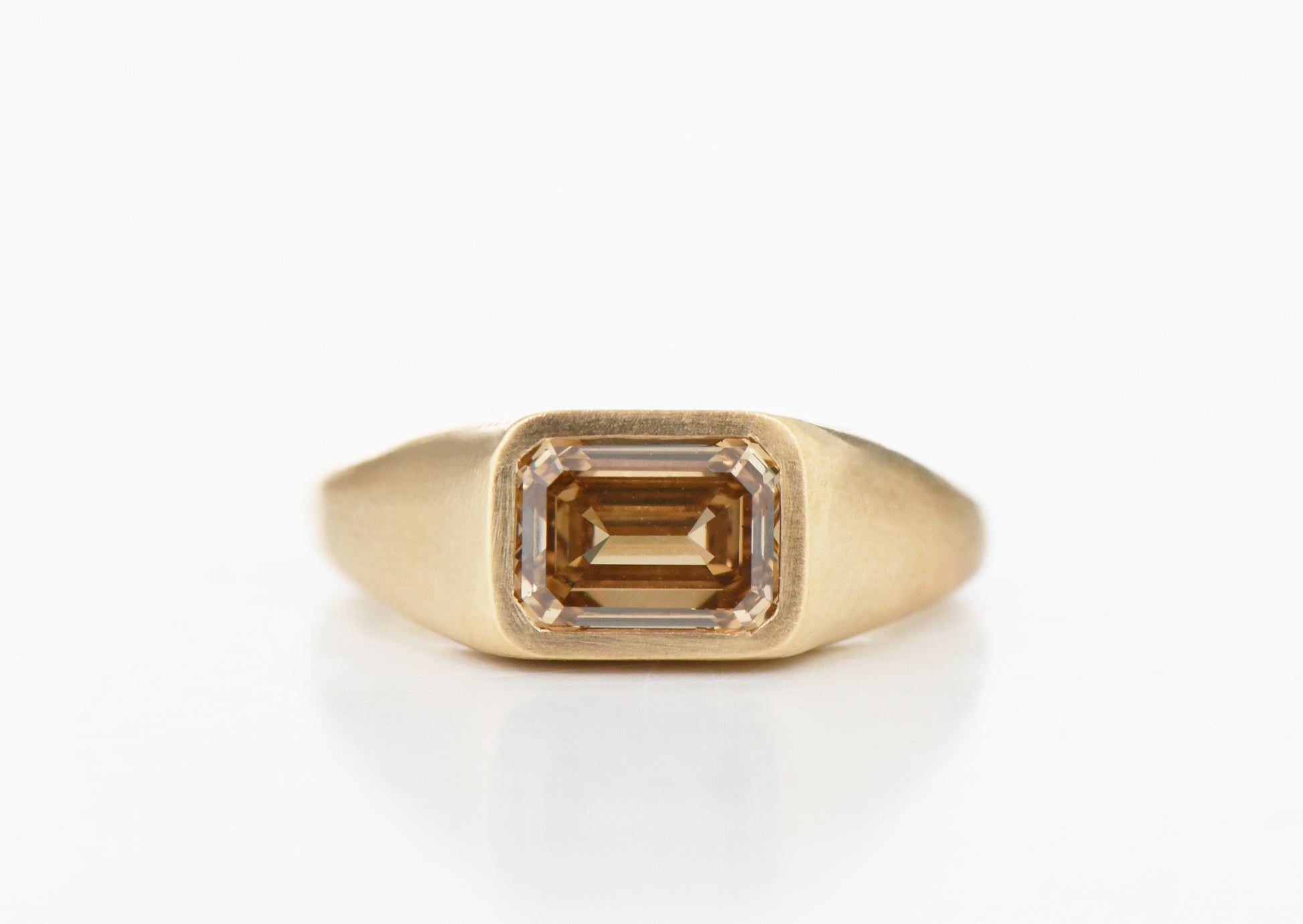 Large geometric emerald cut champagne diamond set in 18ct yellow gold. Classic bezel setting with tapered shoulders, flattened band and SB hallmarking at rear.
