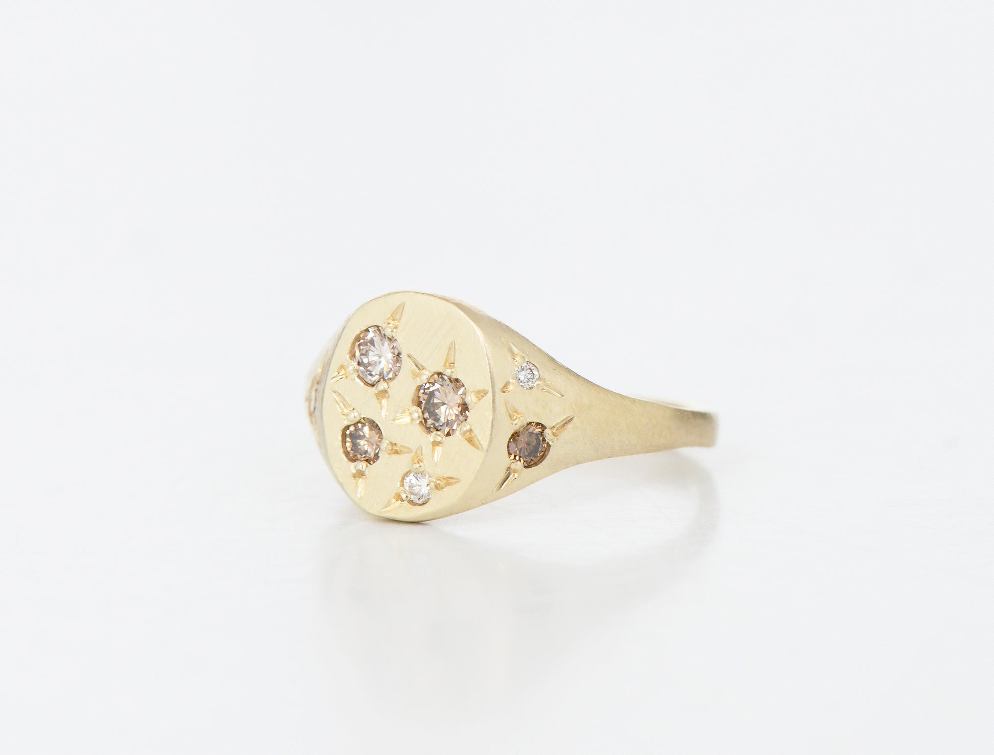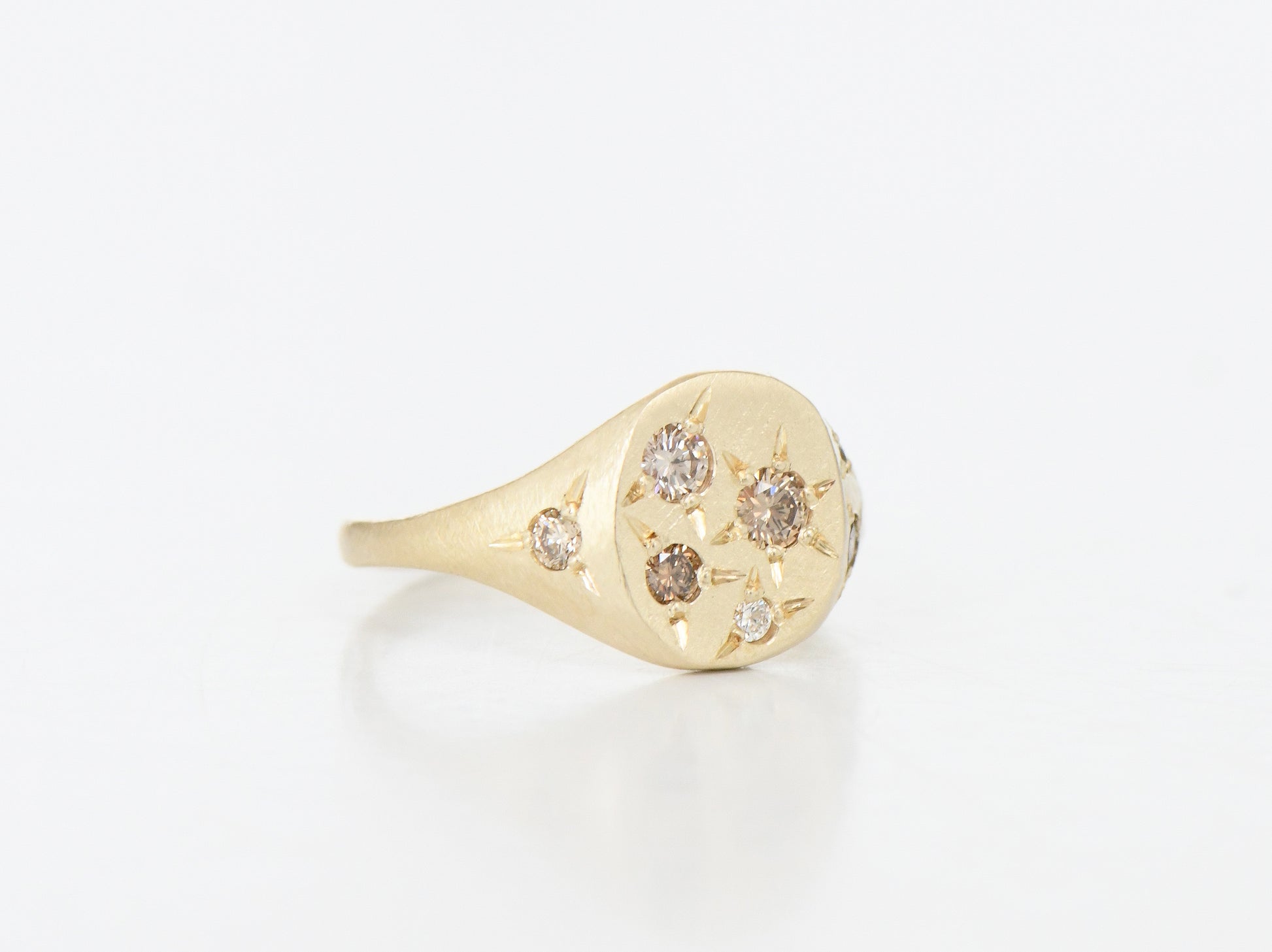 An array of round Champagne diamonds set in recycled 9ct yellow gold. Classic SB signet ring with tapered shoulders and SB hallmarking at rear.