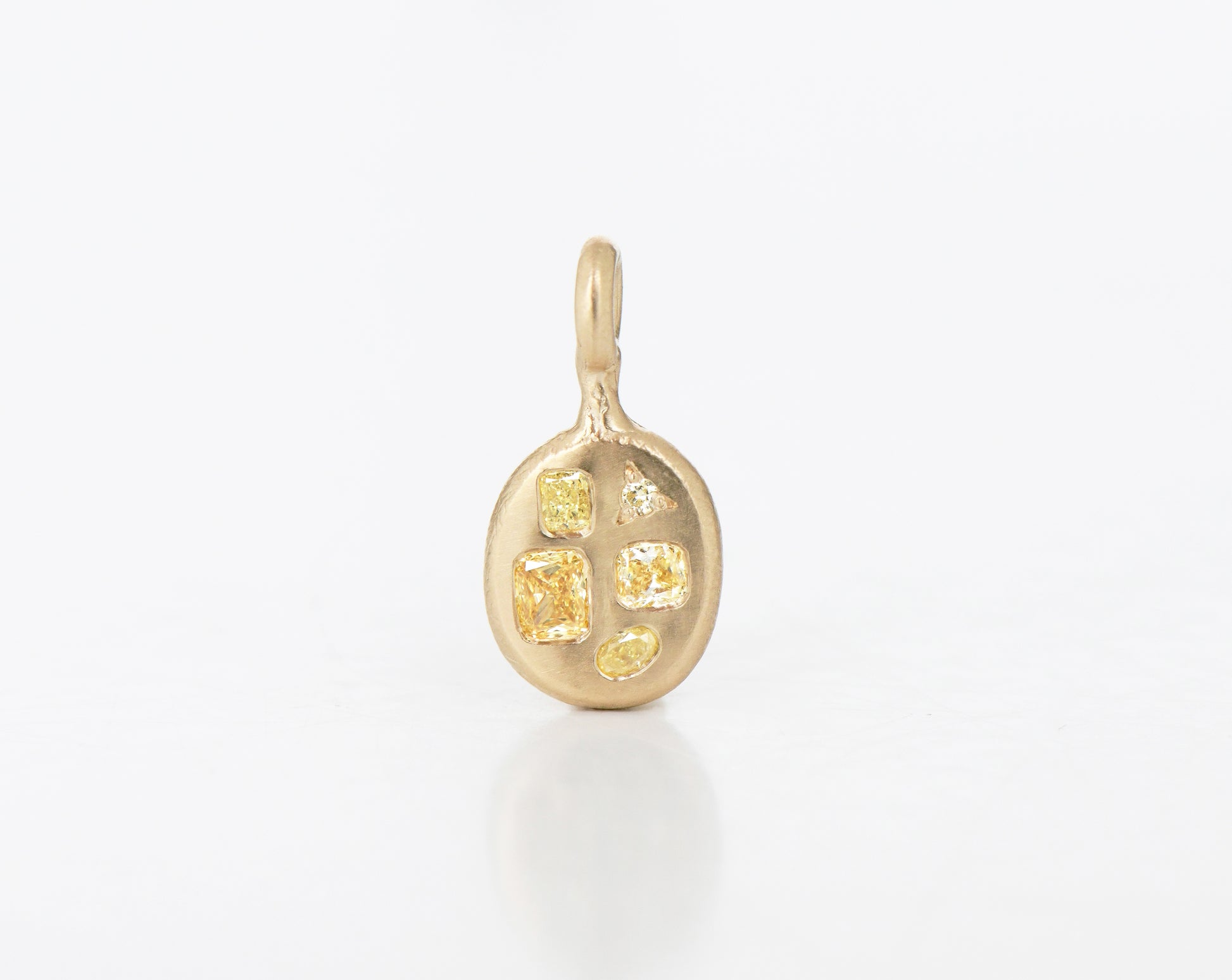 Pendant version of our spazio ring. Round, cushion and oval fancy yellow diamonds set in a 9ct yellow gold pendant. Included is a 50cm round curb chain and clasp.