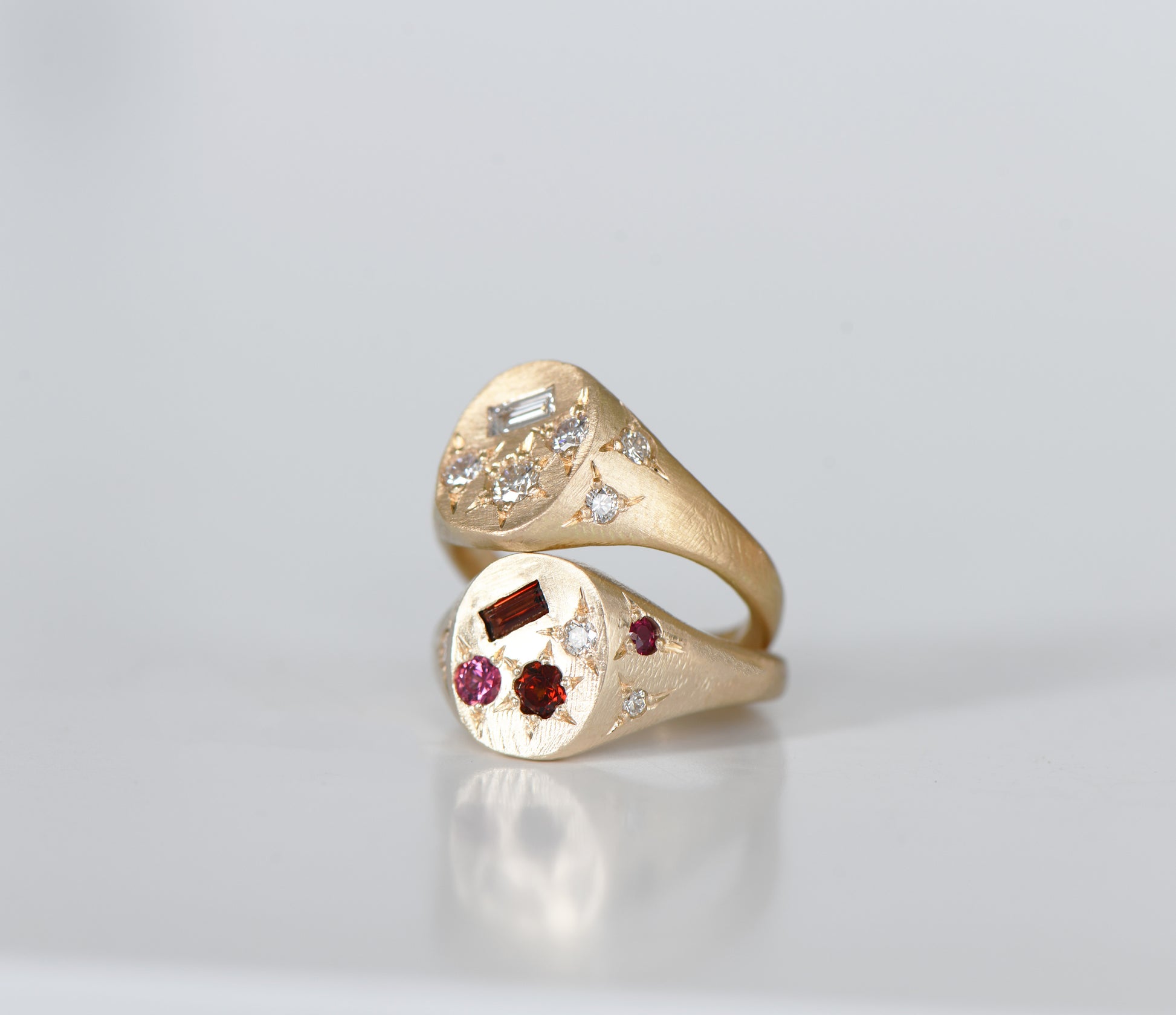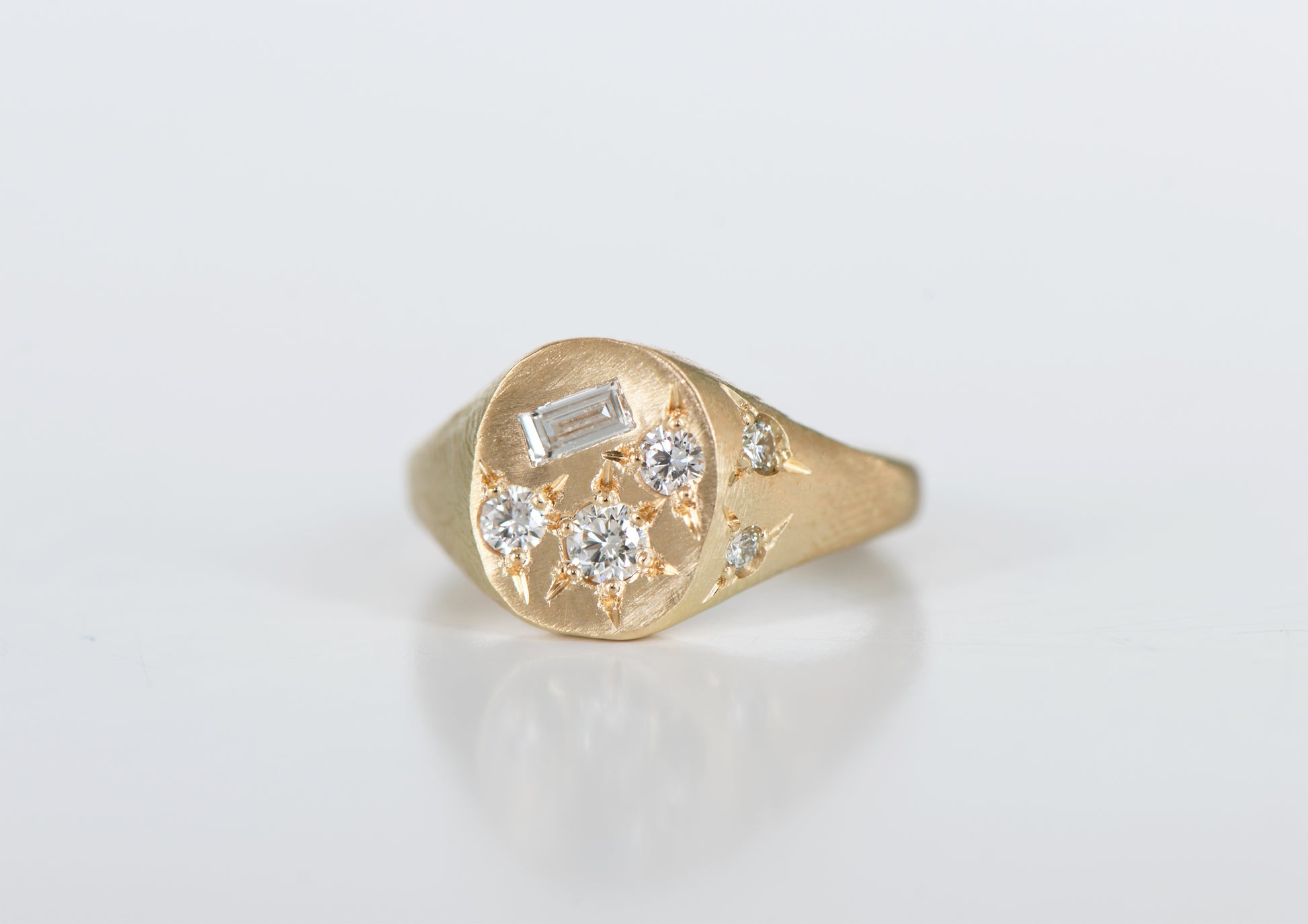 Spazio ring set with an array of white diamonds. Offset baguette, half round band and SB hallmarking at rear.
