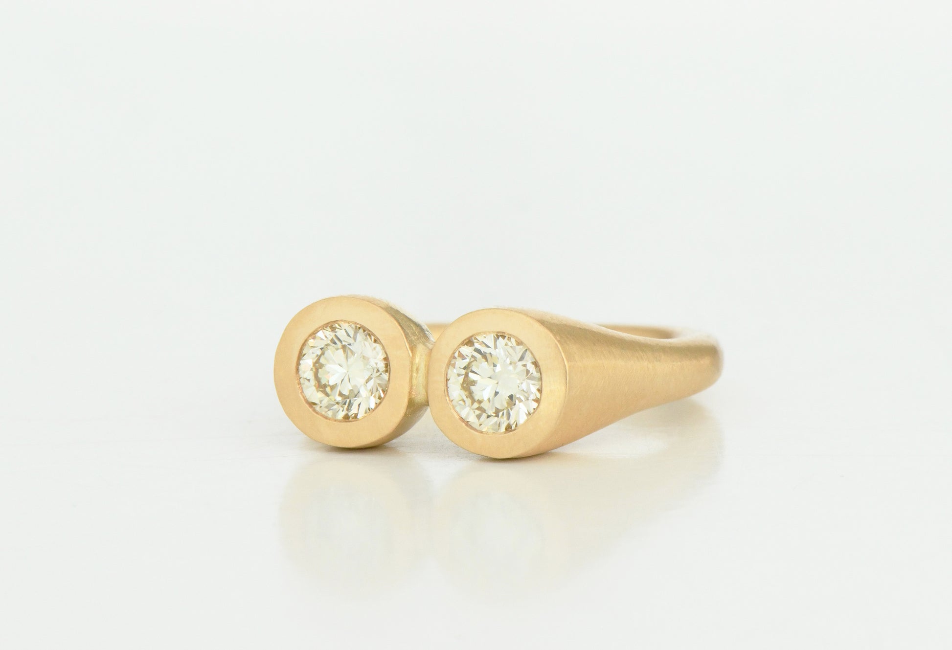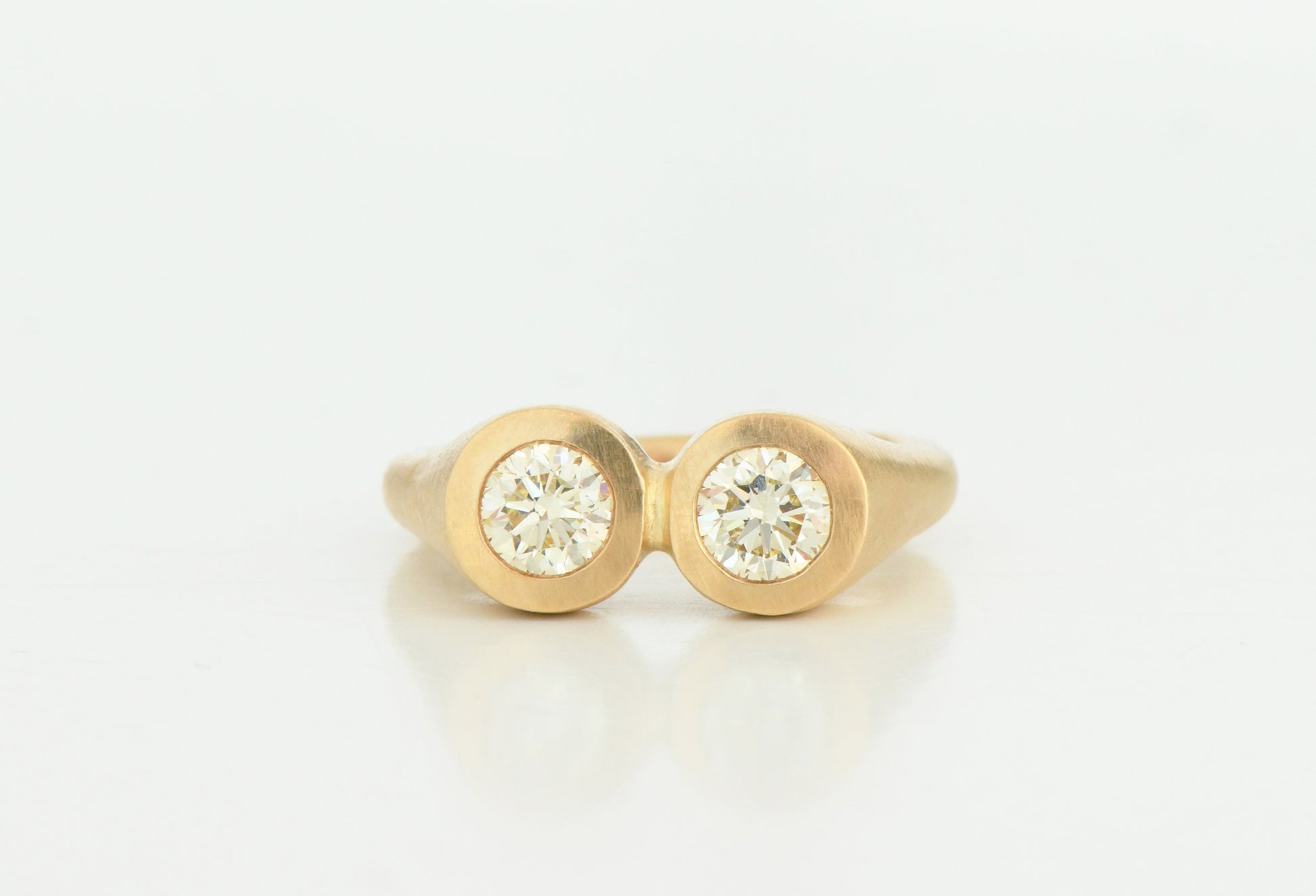 Double flush set matching diamonds set in 18ct yellow gold. Column shaped shoulders, rounded band and SB hallmarking at rear. An extension of our recurring eye motif.