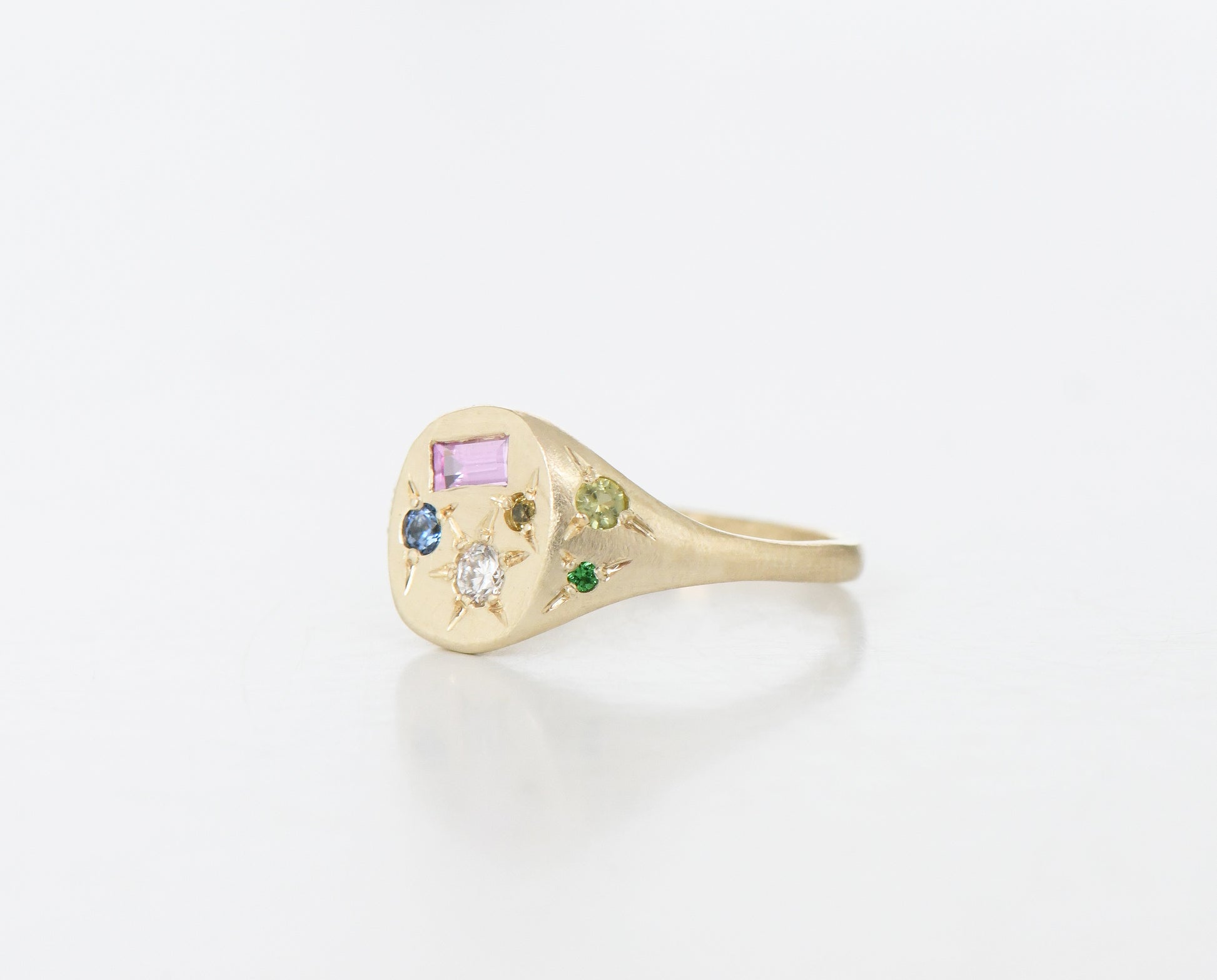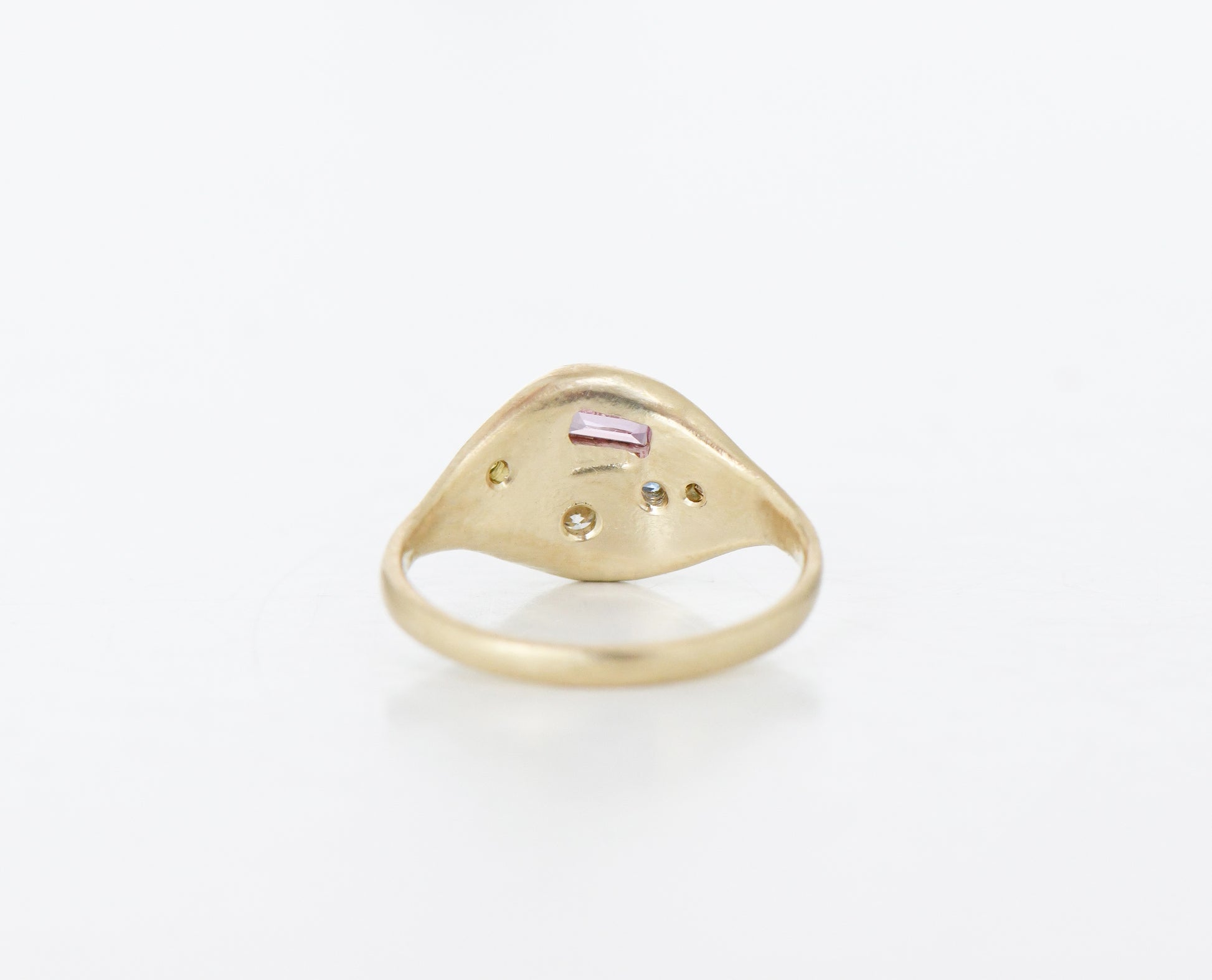 A pastel hued version of our popular Neapolitan style. Recycled 9ct yellow gold signet ring with an array of gemstones, tapered shoulders, thin flat band and SB hallmarking at rear.