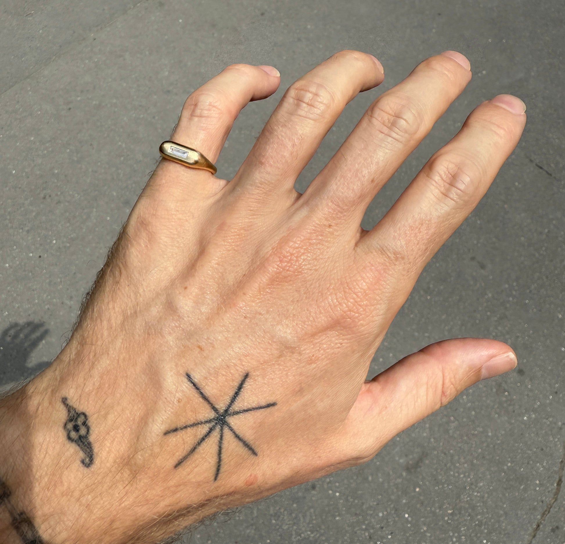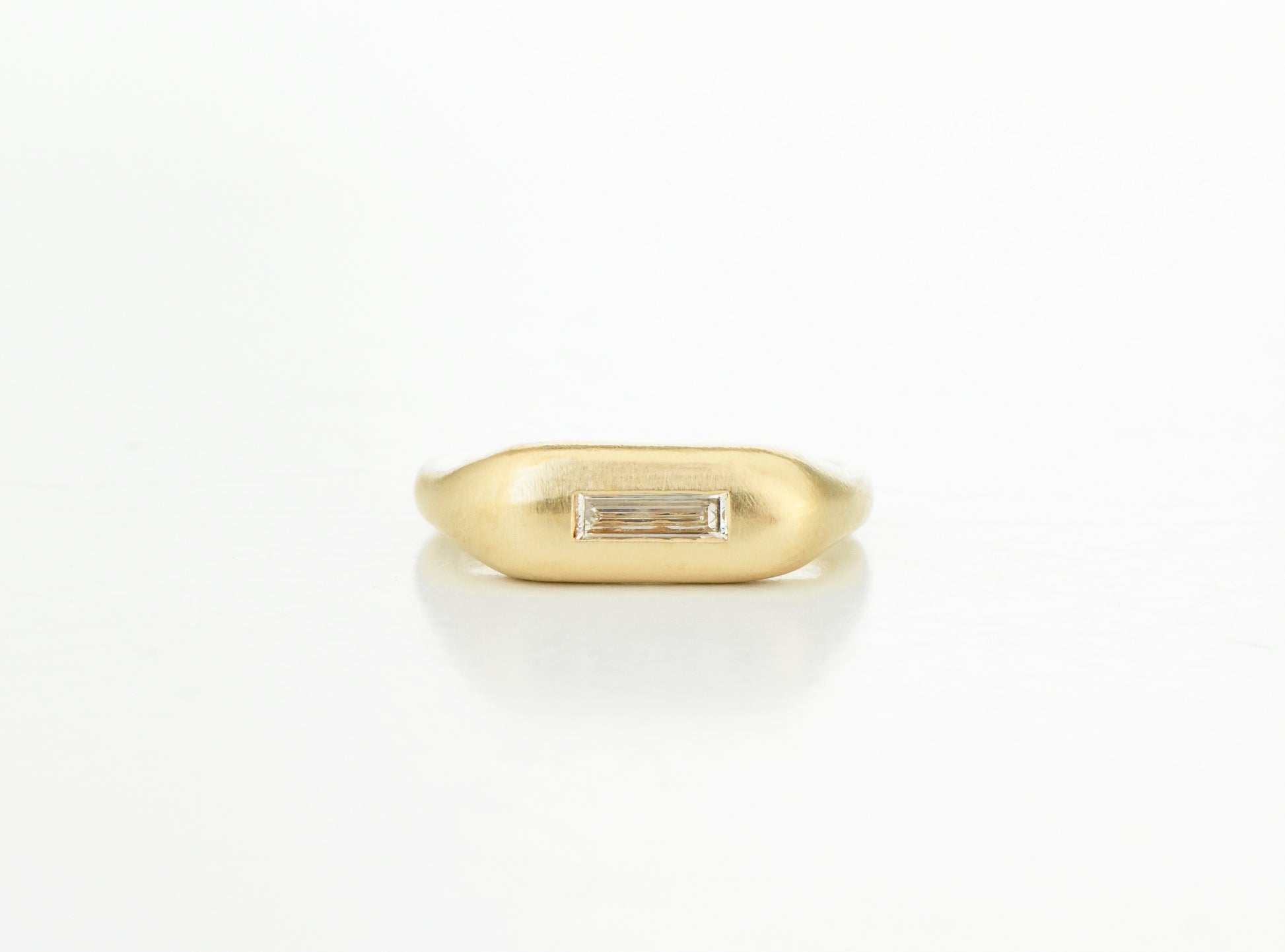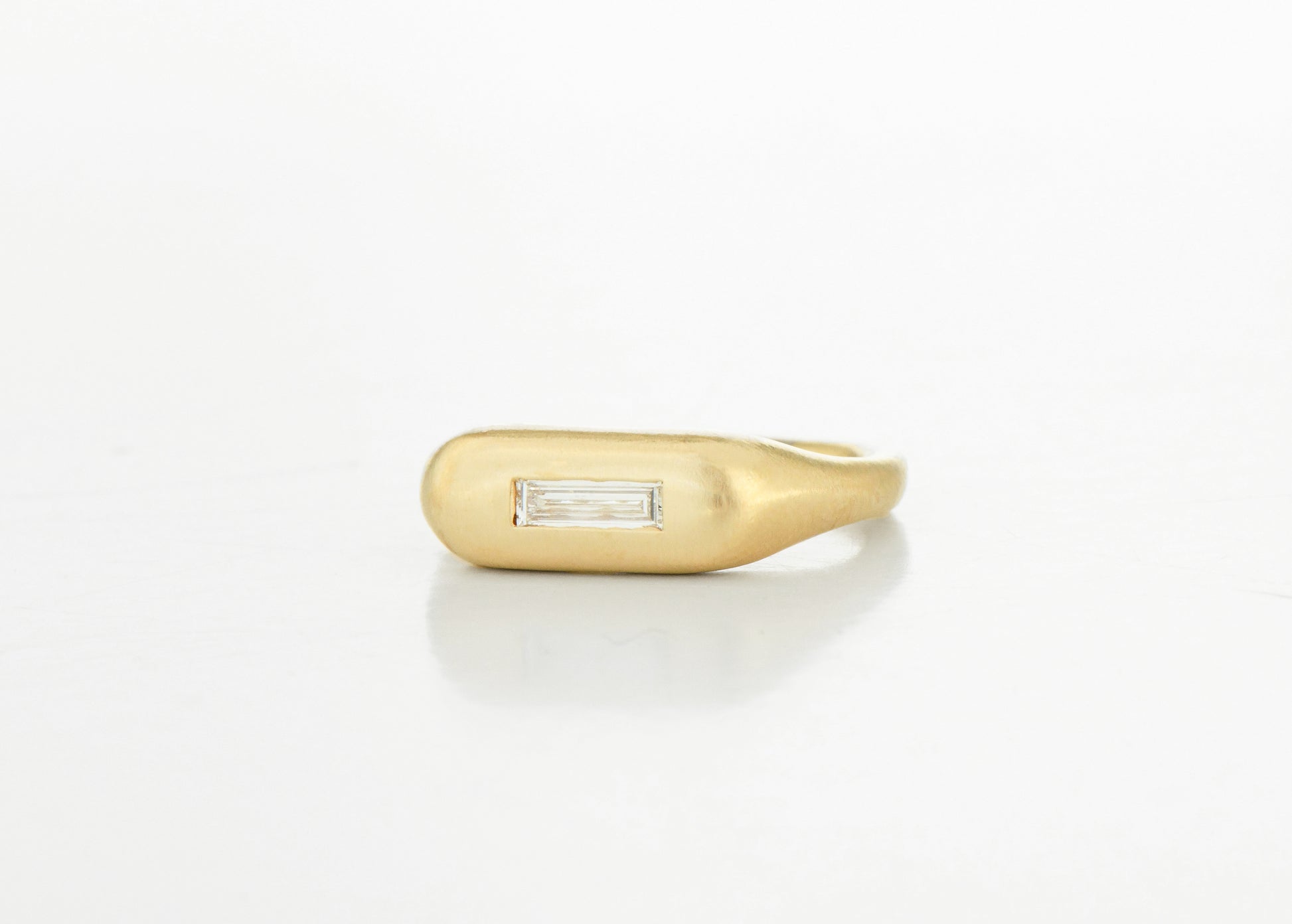A slightly scaled up version of the popular Pill design. Barrel shaped face with slender white diamond. An off kilter engagement ring design with rounded thin band and SB hallmarking at rear.