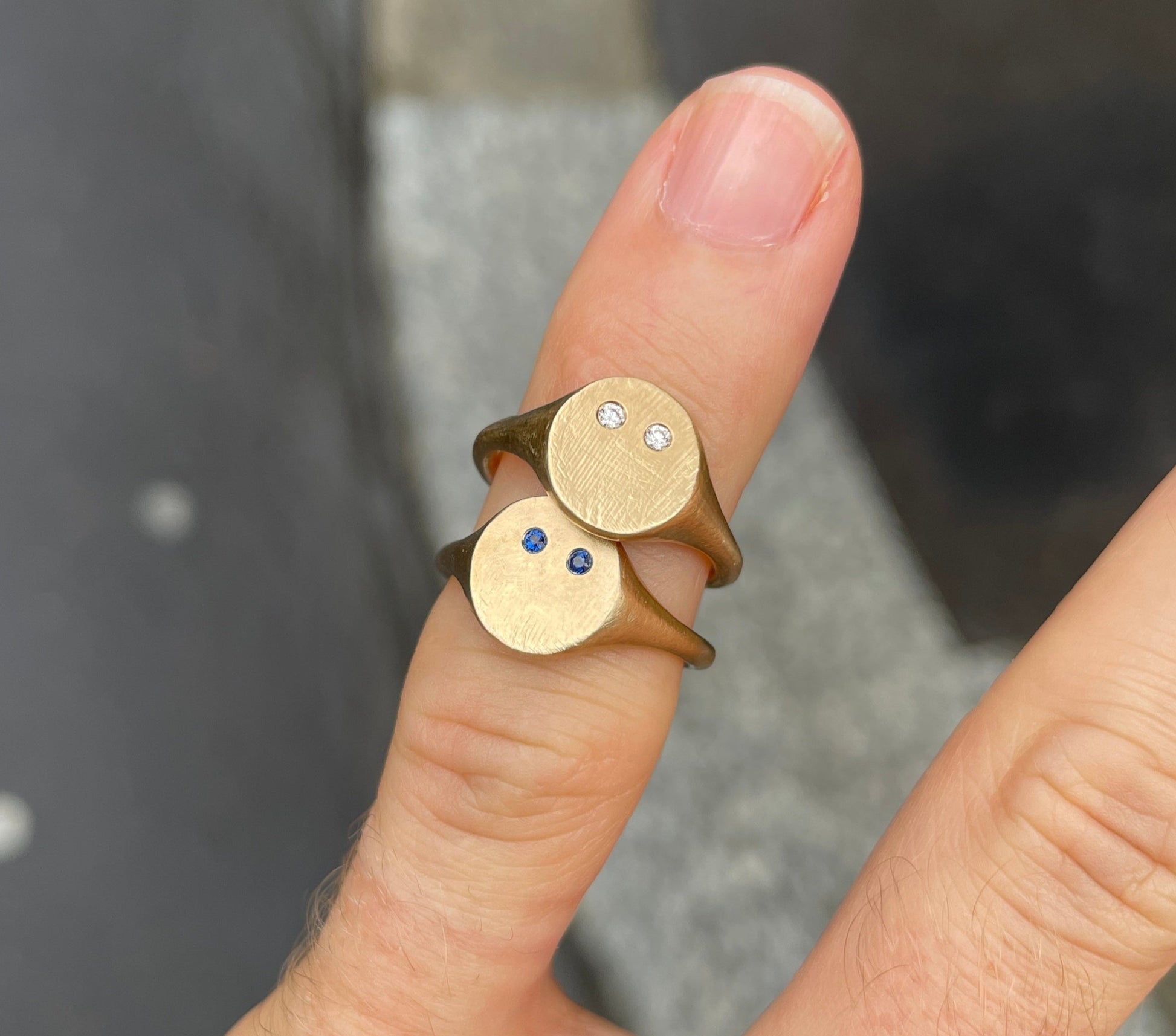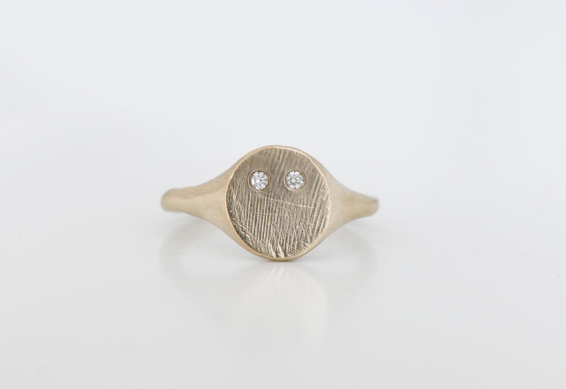 Tiny signet with two diamonds set as the eyes. Rough finish, thin band and SB hallmarking at rear.