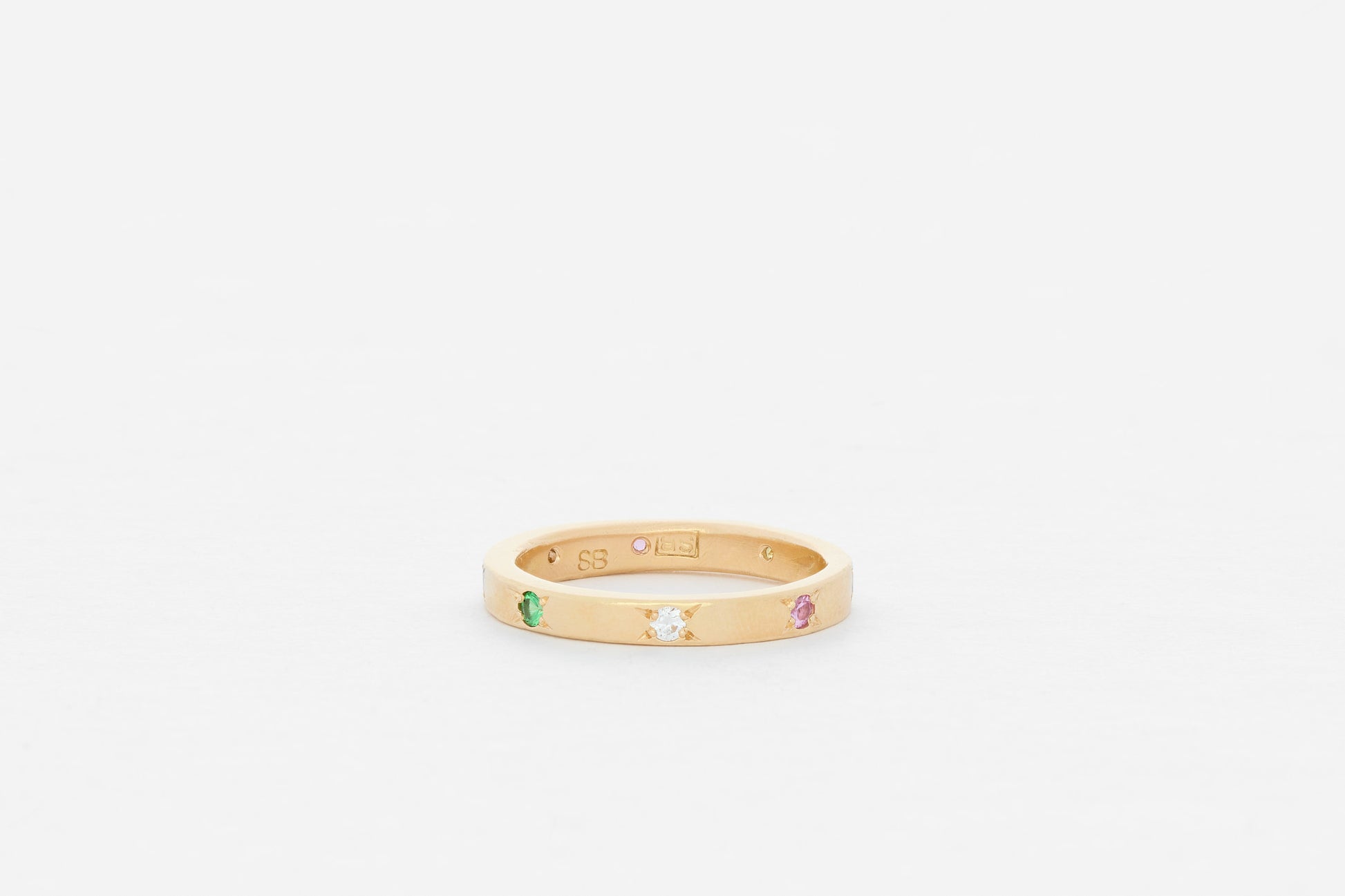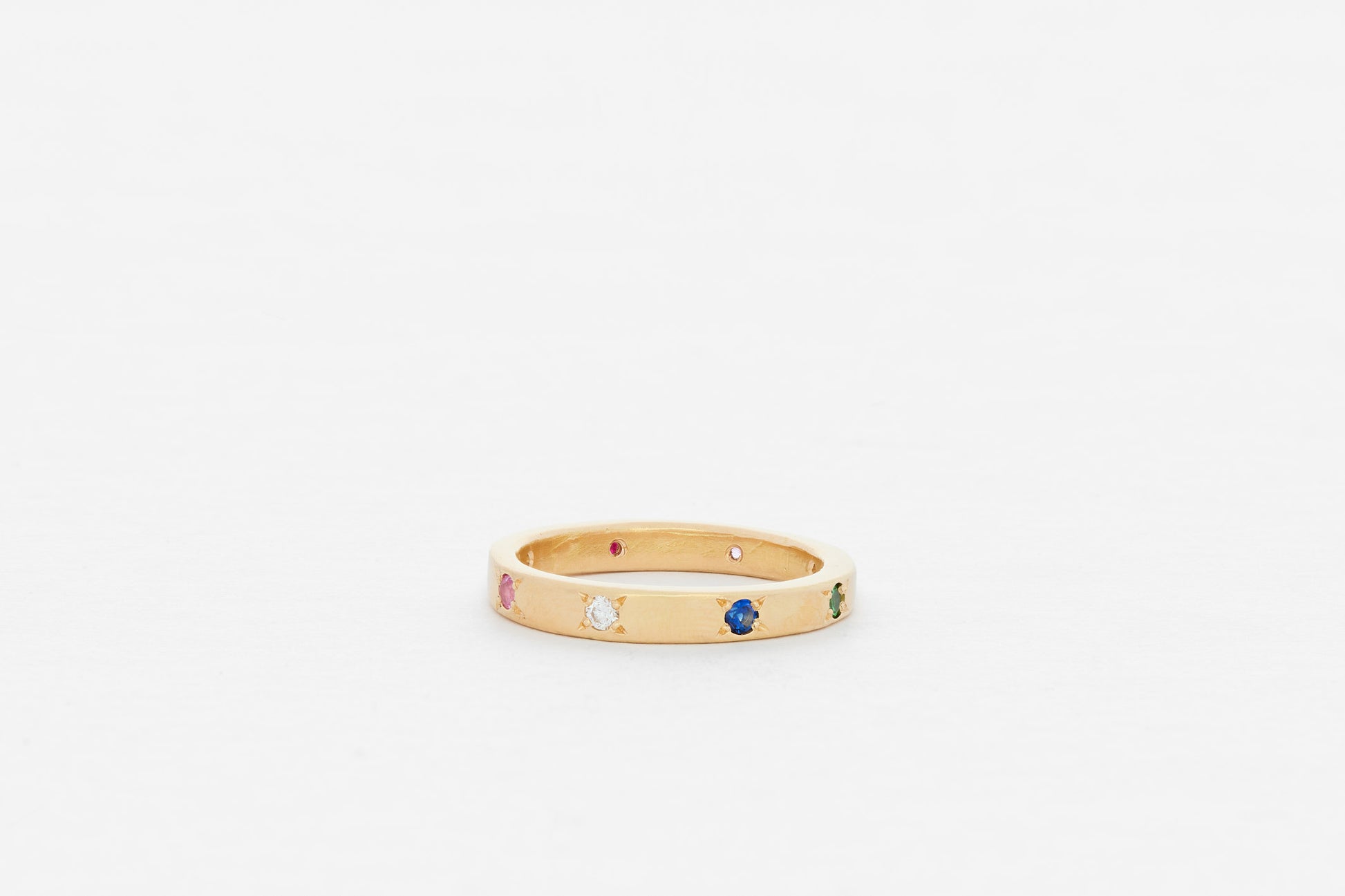A medium width 3mm rectangular profiled band with an array of coloured stones, bead set at the compass points. Once created this piece cannot be re-sized.