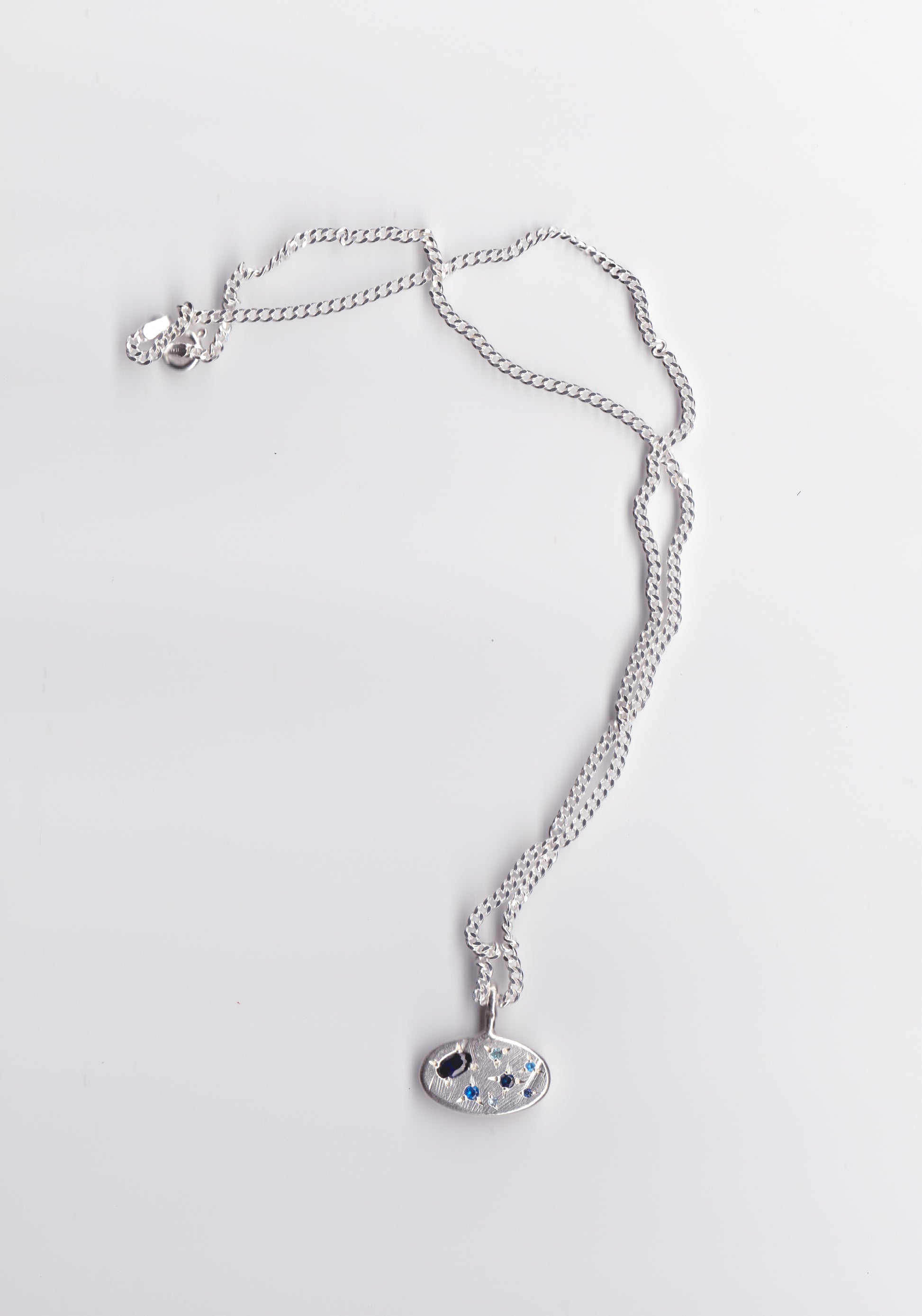A pendant version of the Neapolitan oval ring. An 18mm width Oval tab pendant on a 42cm curb chain set with Australian sapphires, synthetic blue sapphires, synthetic bright blue spinel, topaz, aquamarine and Ceylon sapphires.