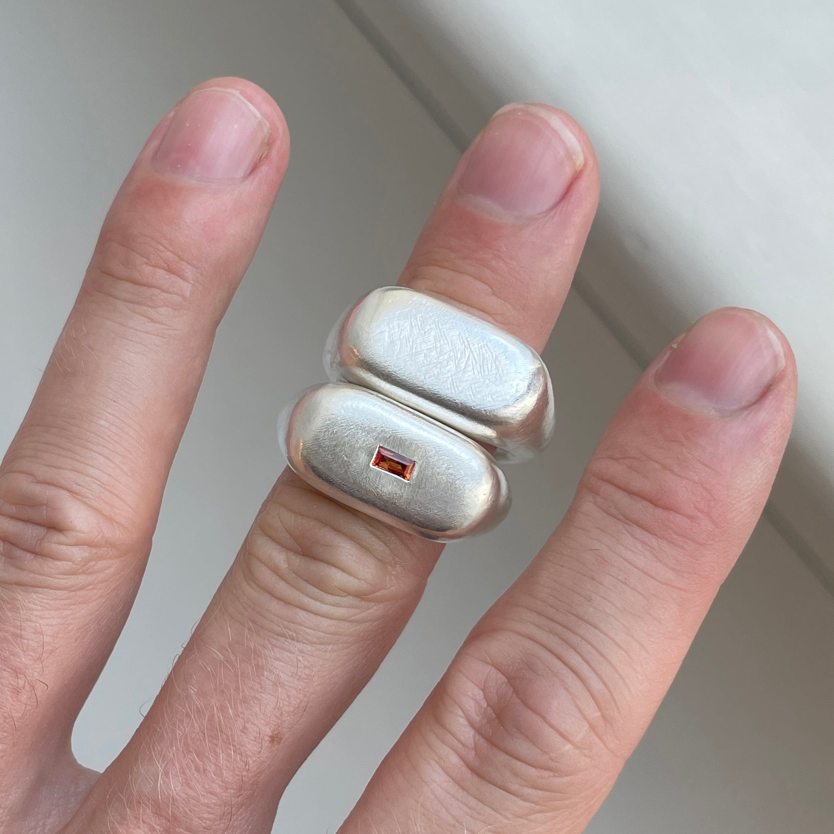 Huge symmetrical lump shaped ring inspired by Egyptian relics at The Louvre. Small orange sapphire set at face. Rounded band and SB hallmarking at rear.