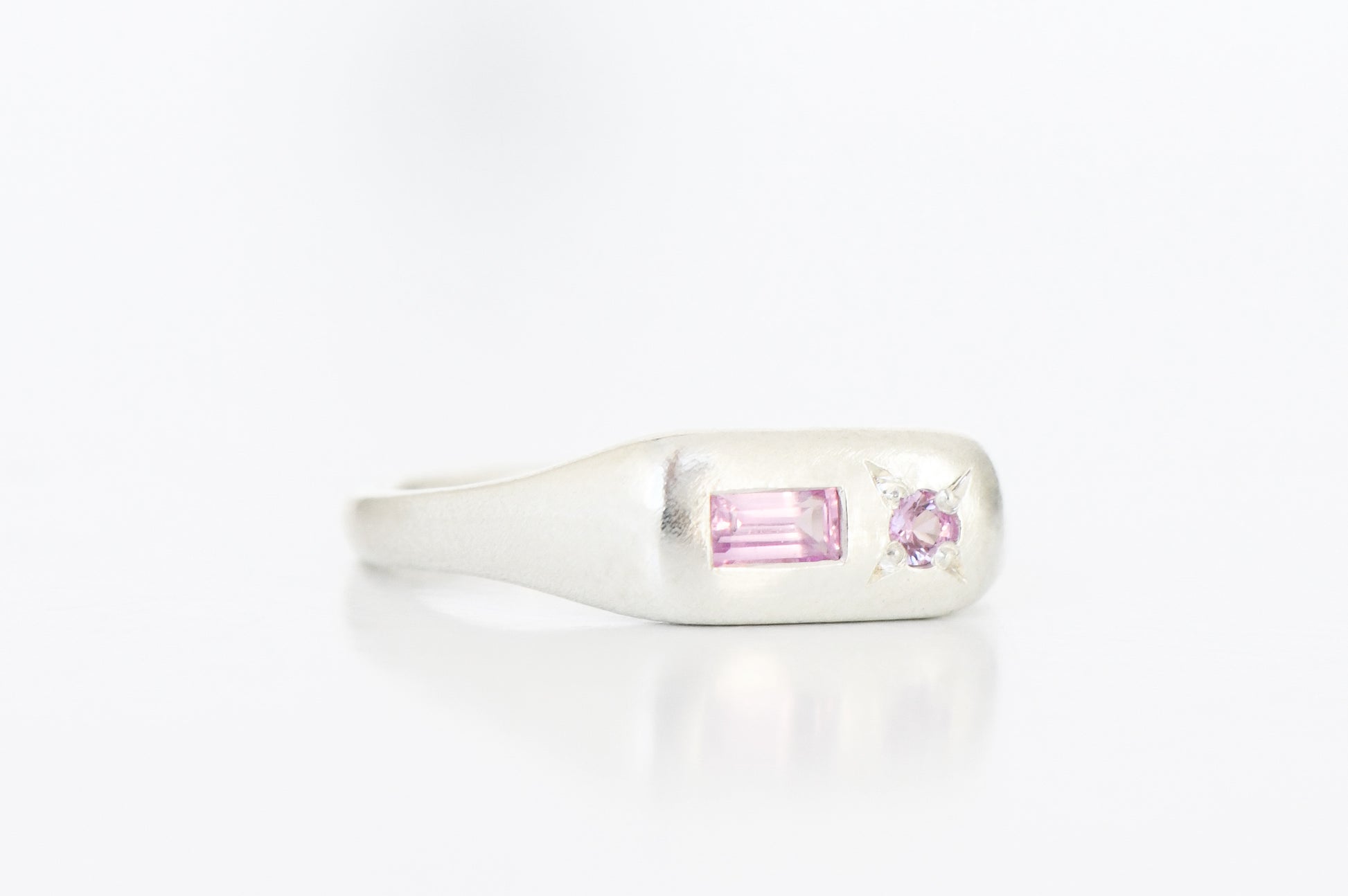 Classic SB pill shaped ring in silver with round and baguette pink sapphires. Tapered shoulders, bulbous shape and rounded band. SB hallmarking at rear.