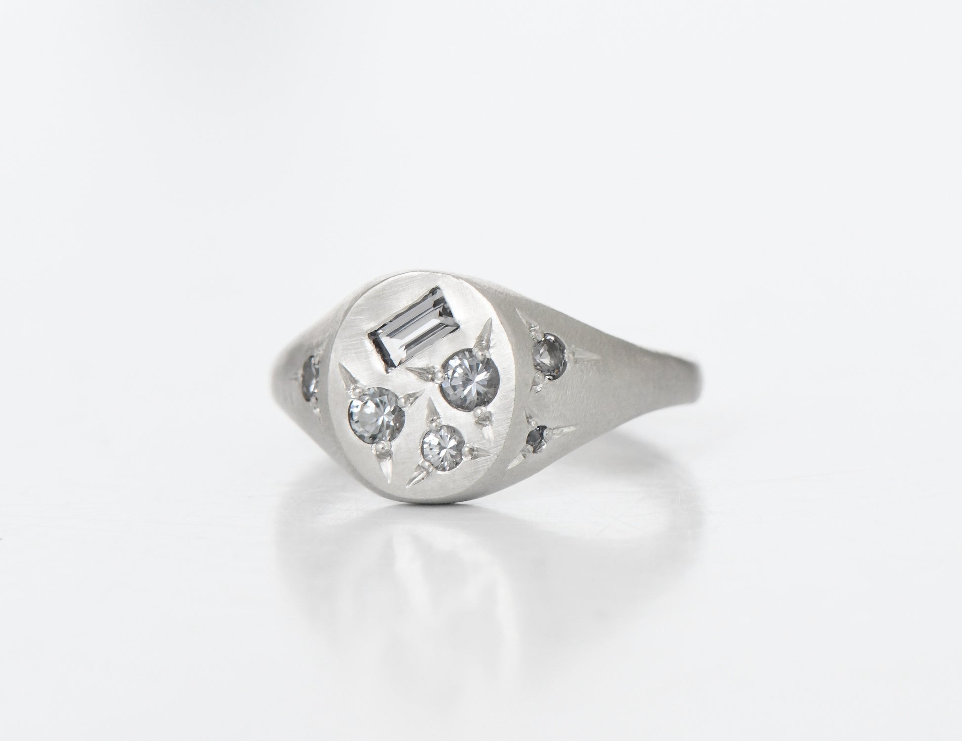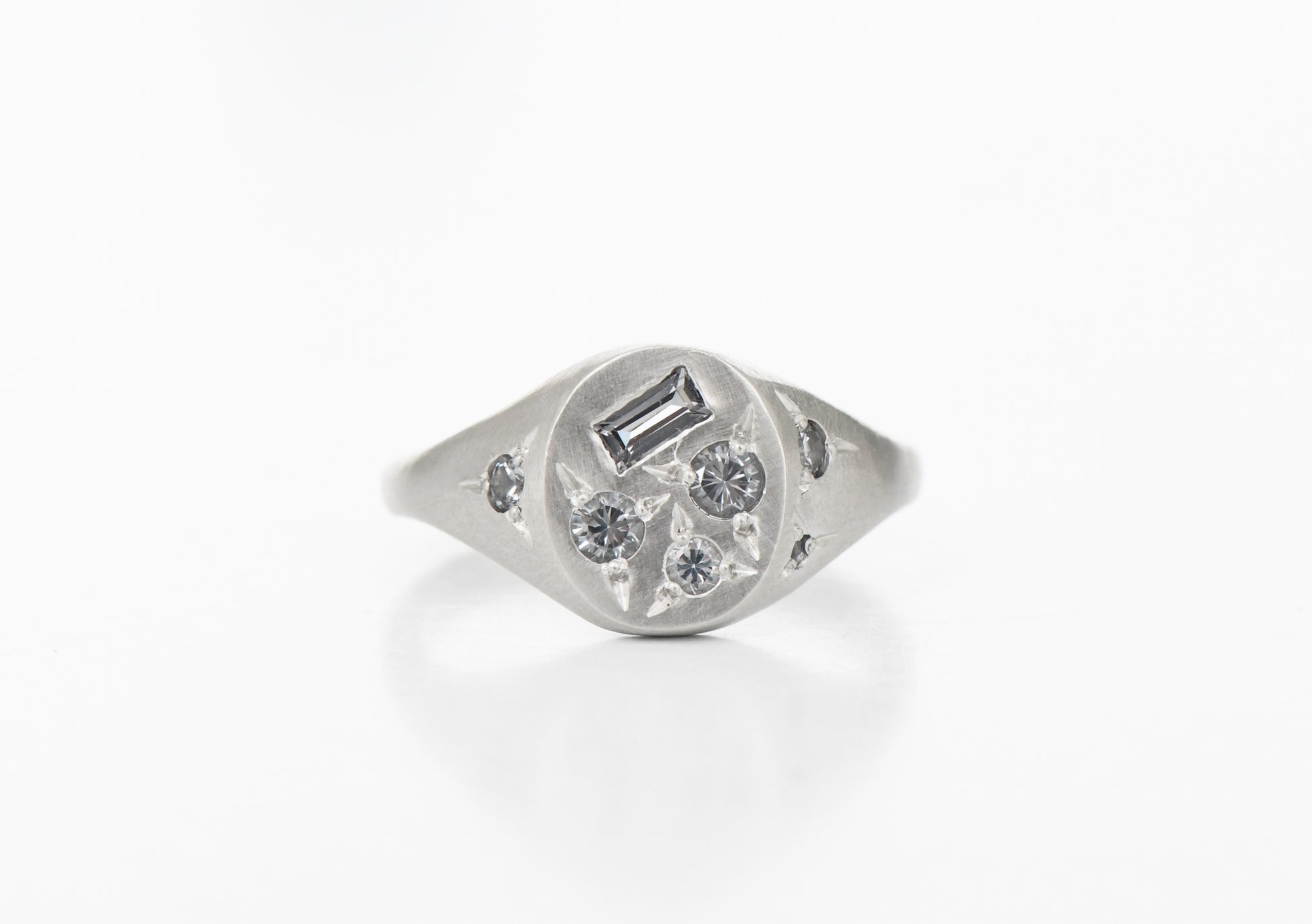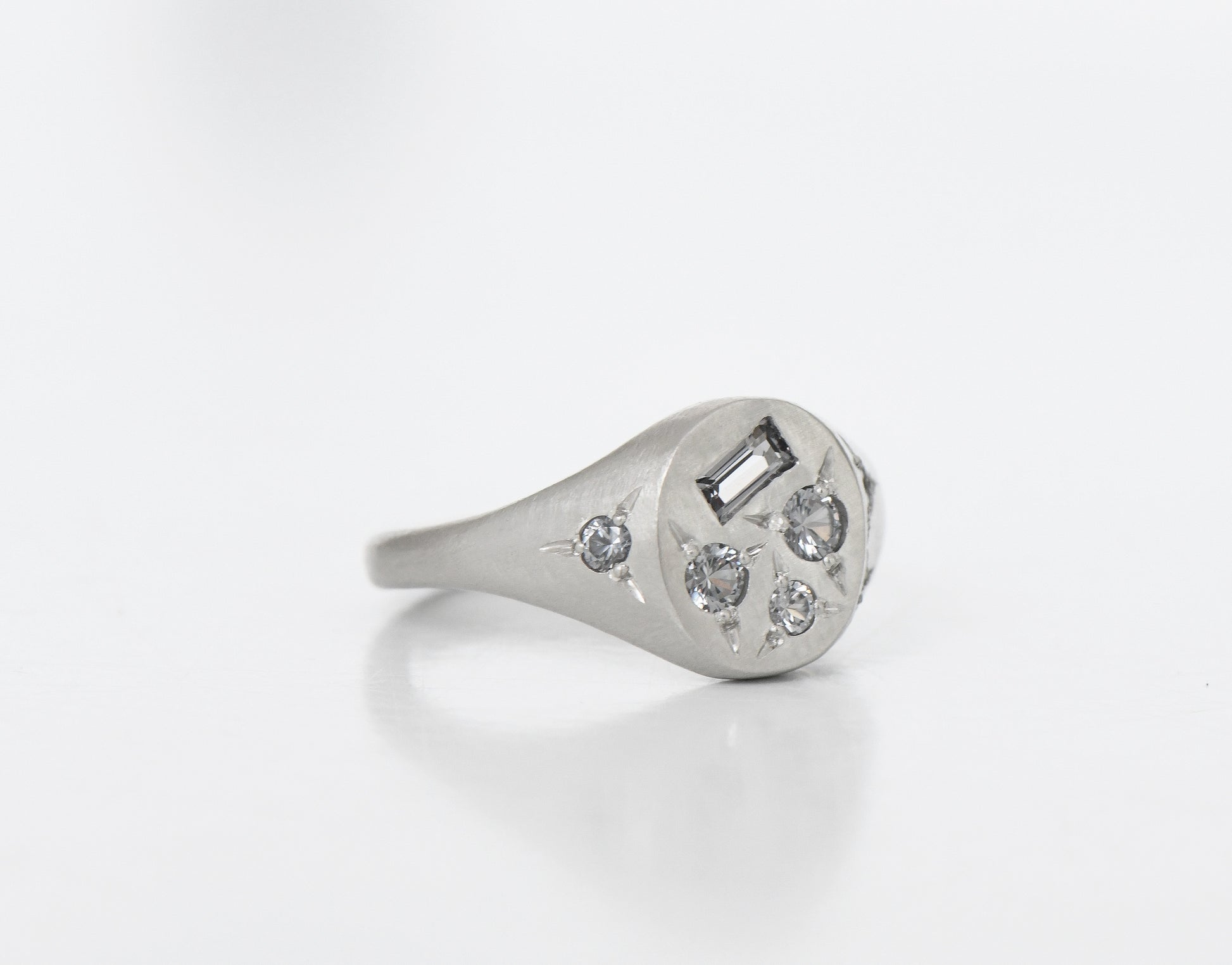 A tonal version of our popular treasure ring. Grey spinels of various shapes set in textured platinum. Tapered shoulders, rounded band and SB hallmarking at rear. Part of an updated series of our most popular style.