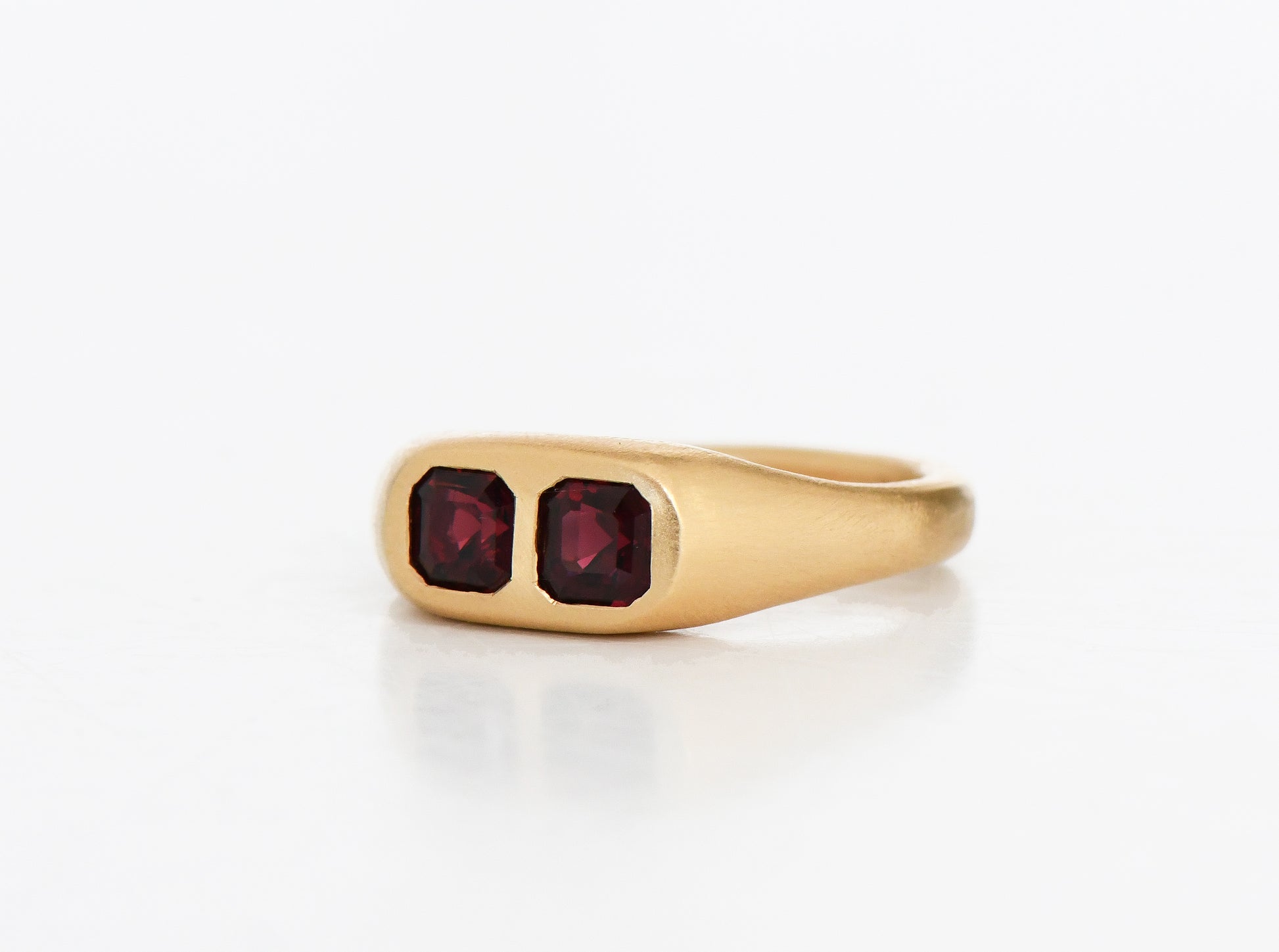 A matching pair of deep red asscher cut spinels set in recycled 18ct yellow gold. Bulbous ring with tapered shoulders, mid polish and SB hallmarking at rear.