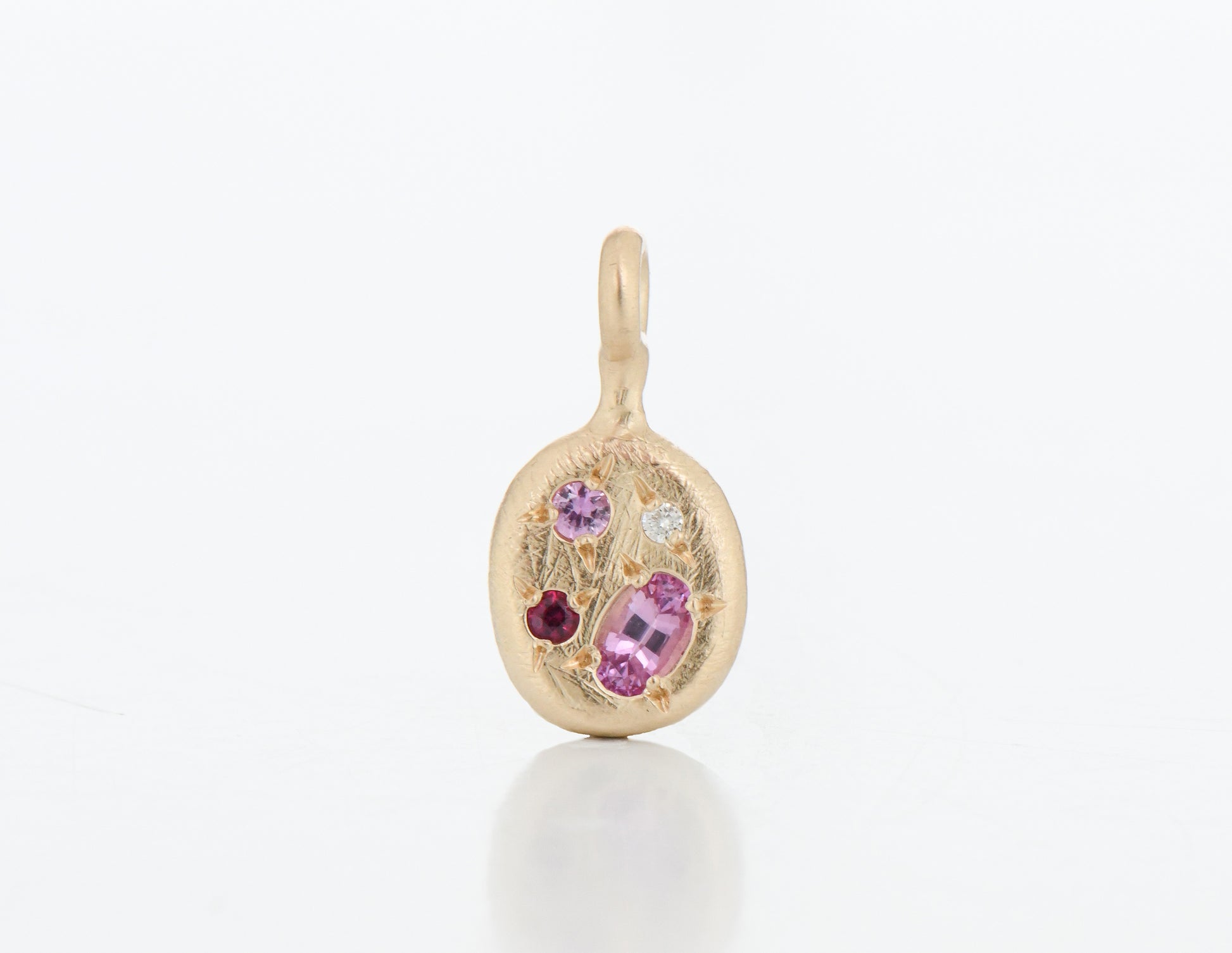 Pendant version of our spazio ring. Round and oval gemstones and a white diamond set in 9ct yellow gold. Included is a 45cm round curb chain and clasp.