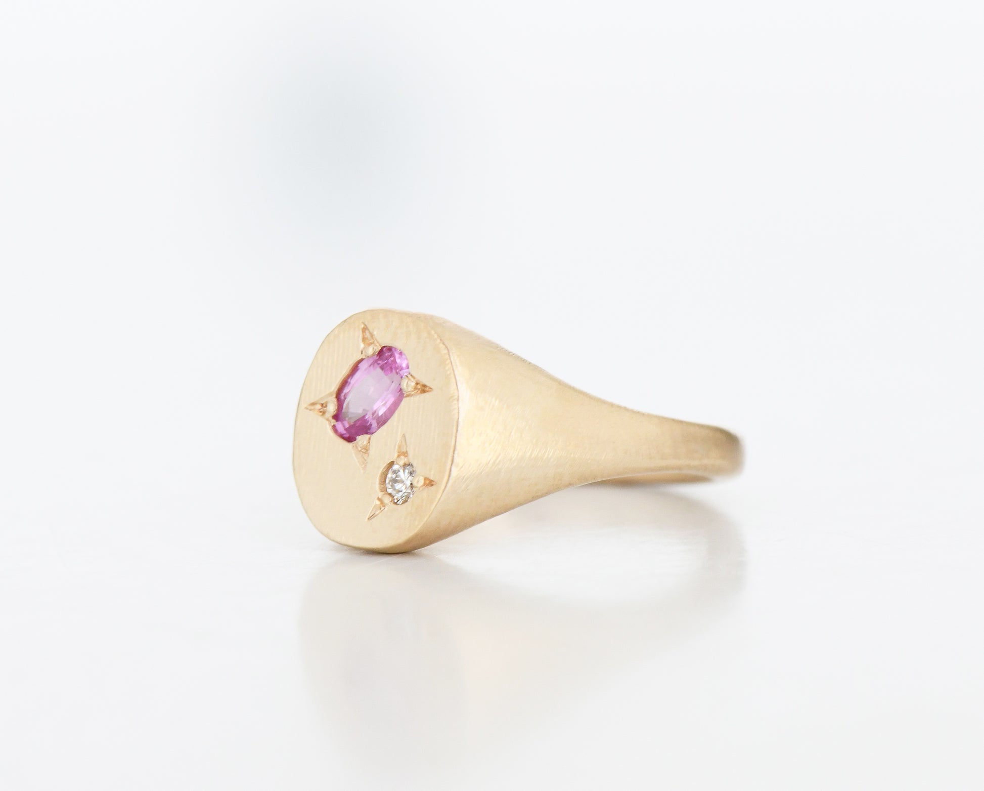 Offset pink sapphire and small white diamond set into recycled 9ct yellow gold. Textured finish; tightly tapered shoulders and SB hallmarking at rear.