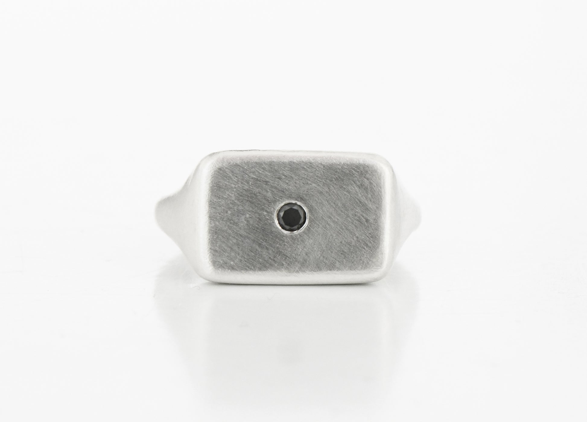Wide rectangular ring with flush set round black diamond. Tapered shoulders, rounded band, hollowed out face and SB hallmarking at rear. Exploration of a wide frame around the stone.