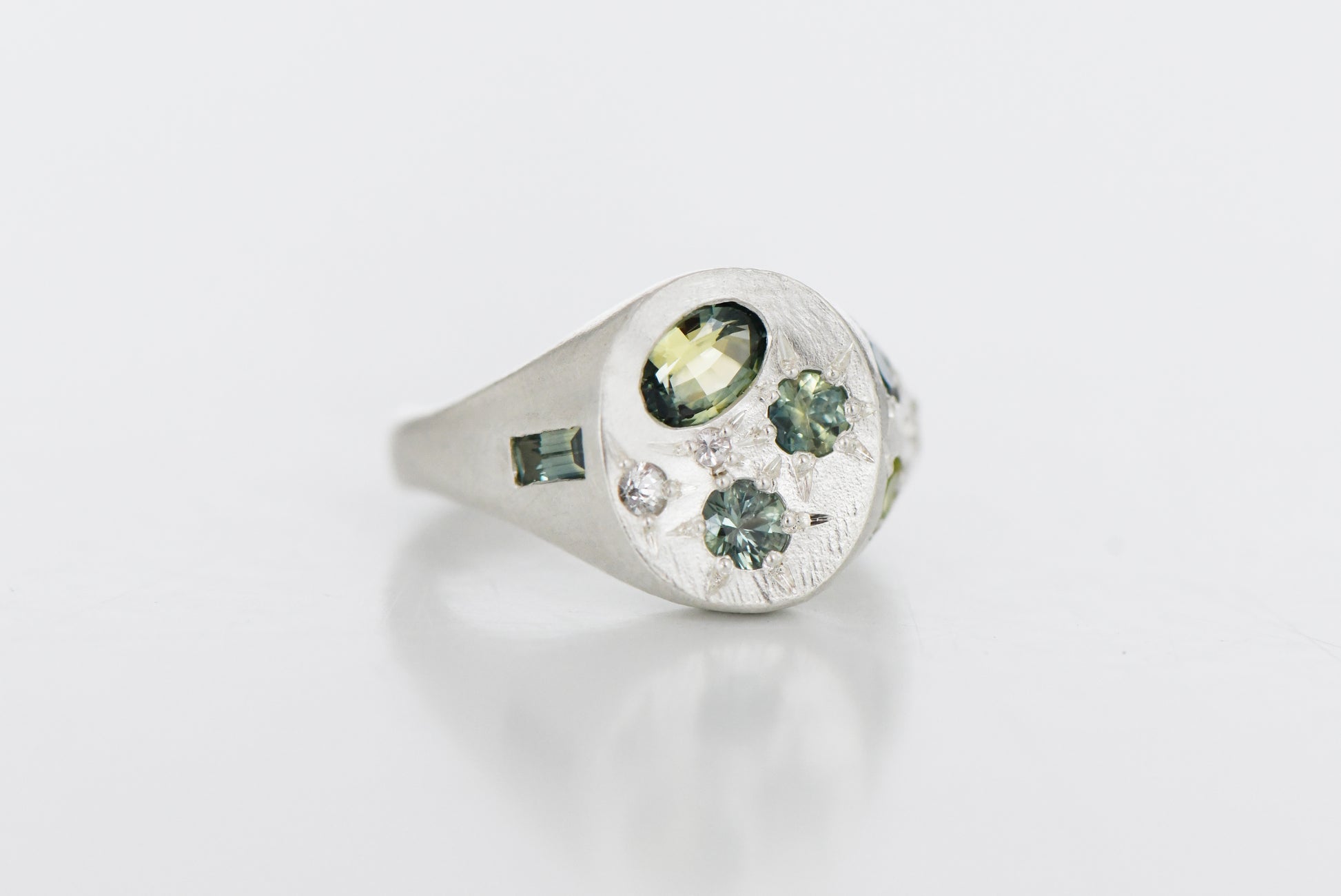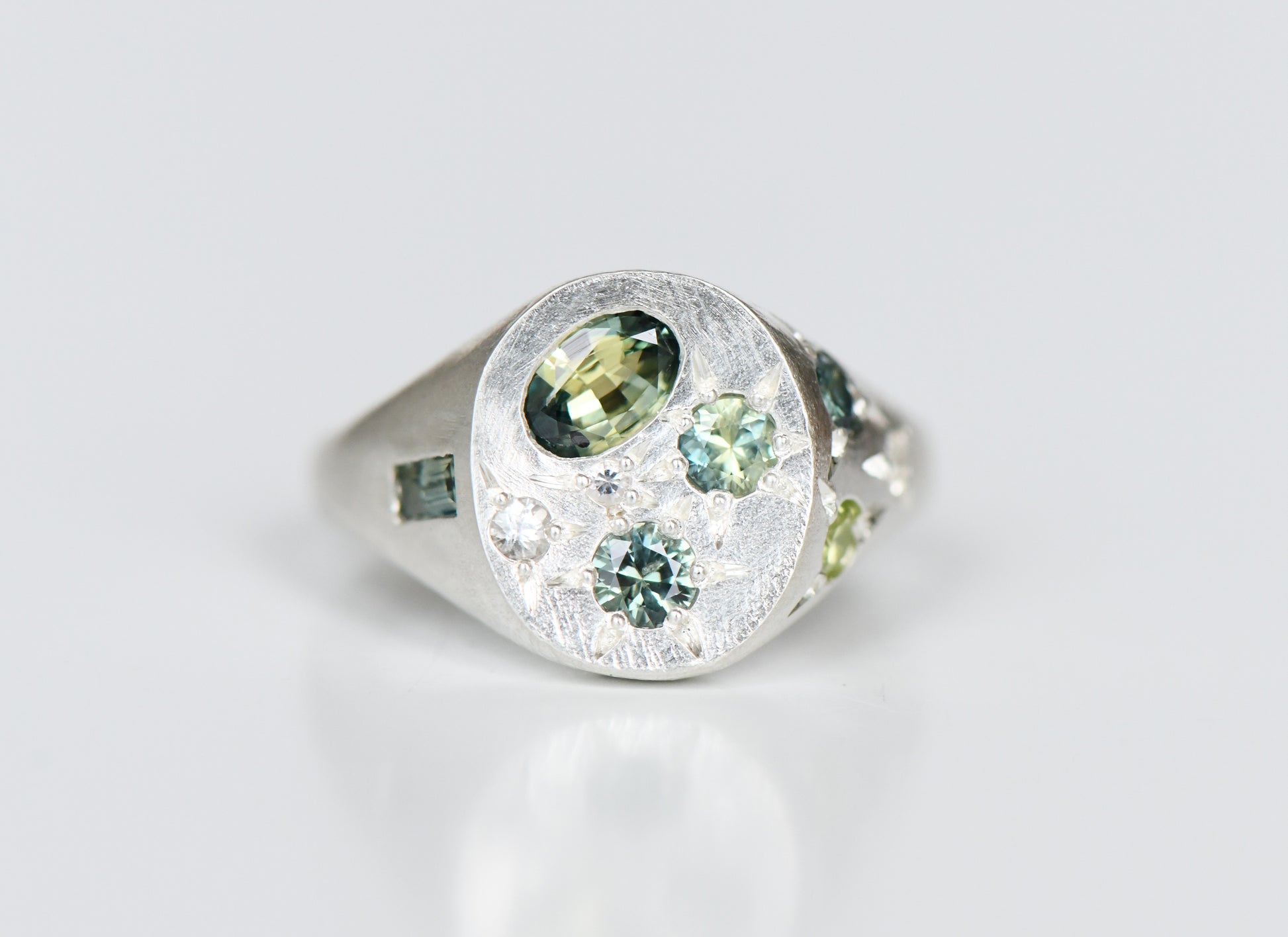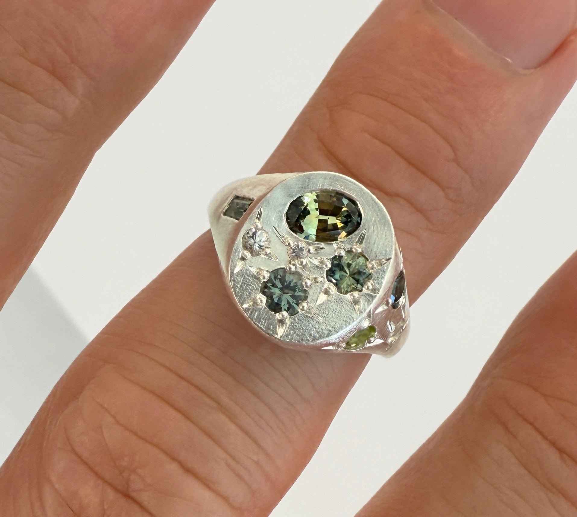 XL Spazio signet ring in textured silver with an array of peridots, parti and white sapphires. Thick band, tapered shoulders and SB hallmarking at rear.