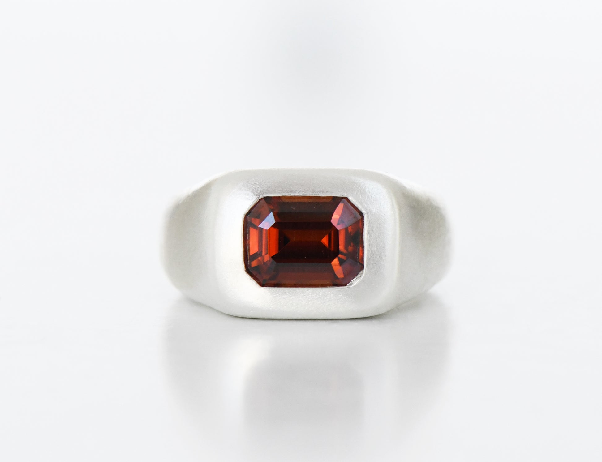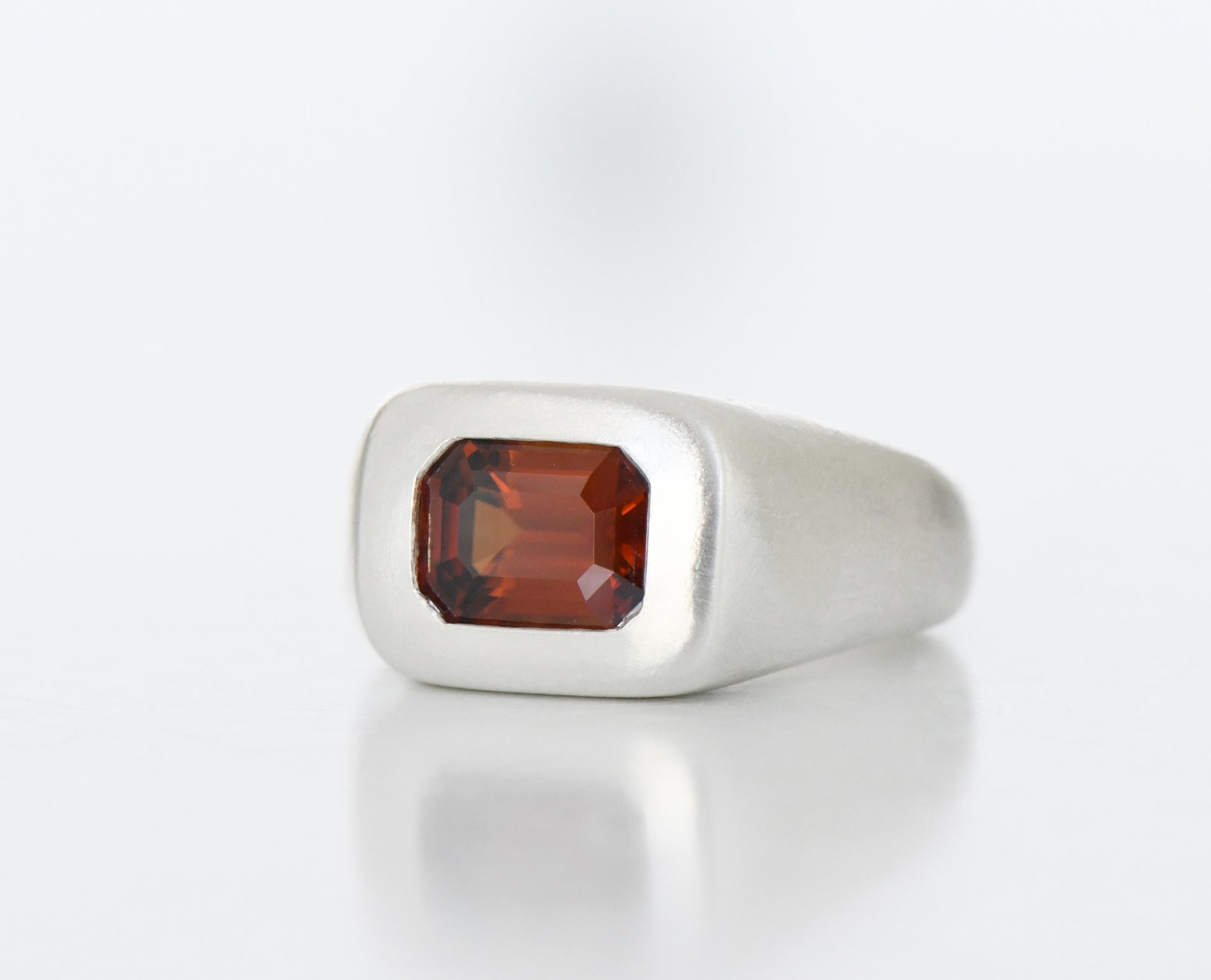 XXL bubble shaped ring with emerald cut Tanzanian zircon flush set with a wide frame. Bulbous shape with flat tapered shoulders and SB hallmarking at rear.