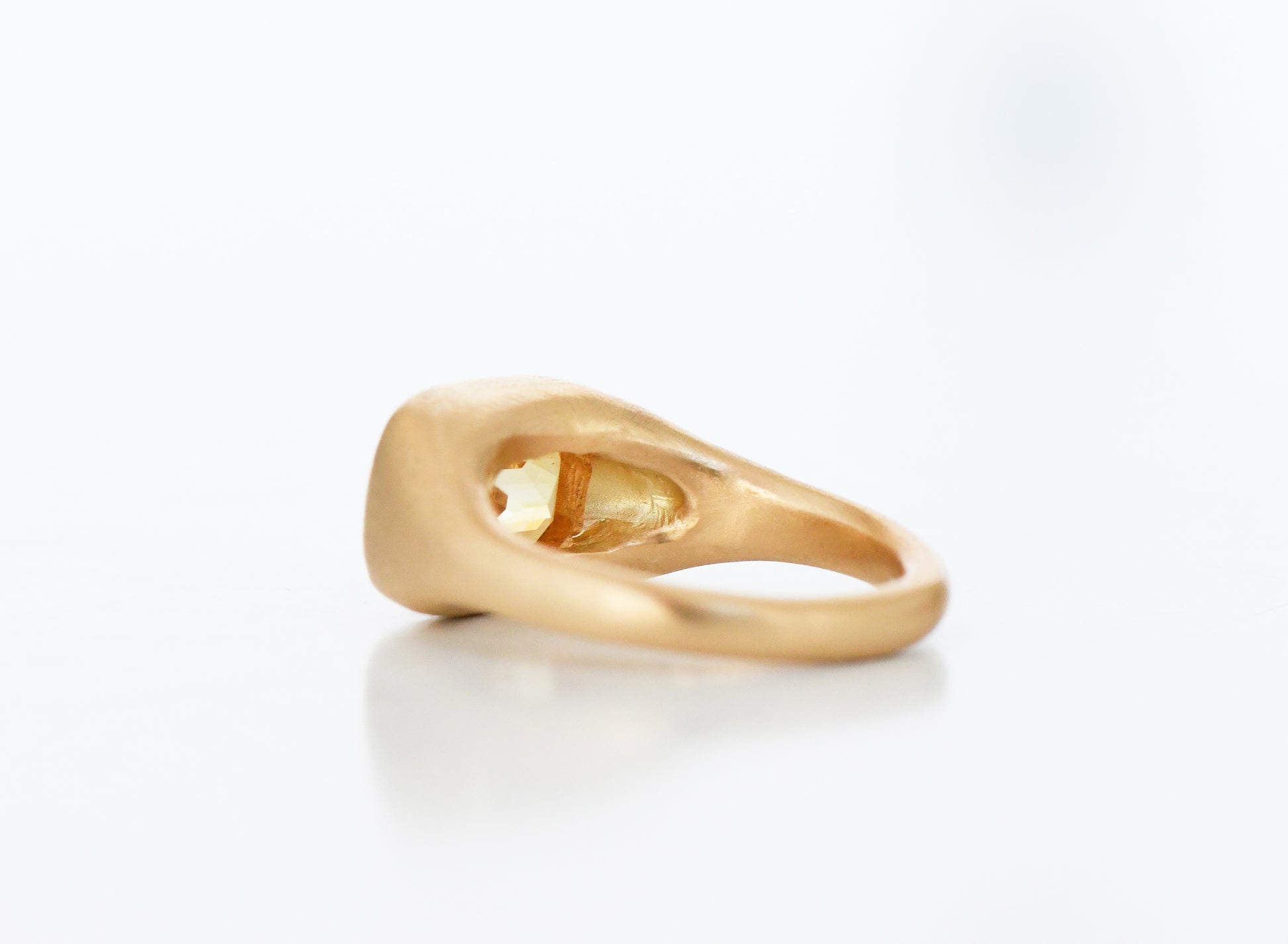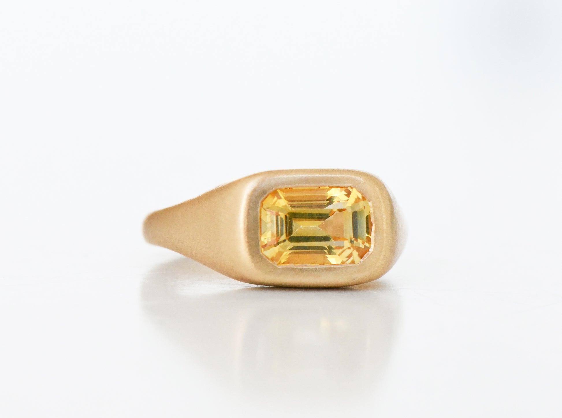 A rounded ring flush set with a geometric emerald cut yellow sapphire. Bulbous band, tapered shoulders, rounded smooth band and SB hallmarking at rear.