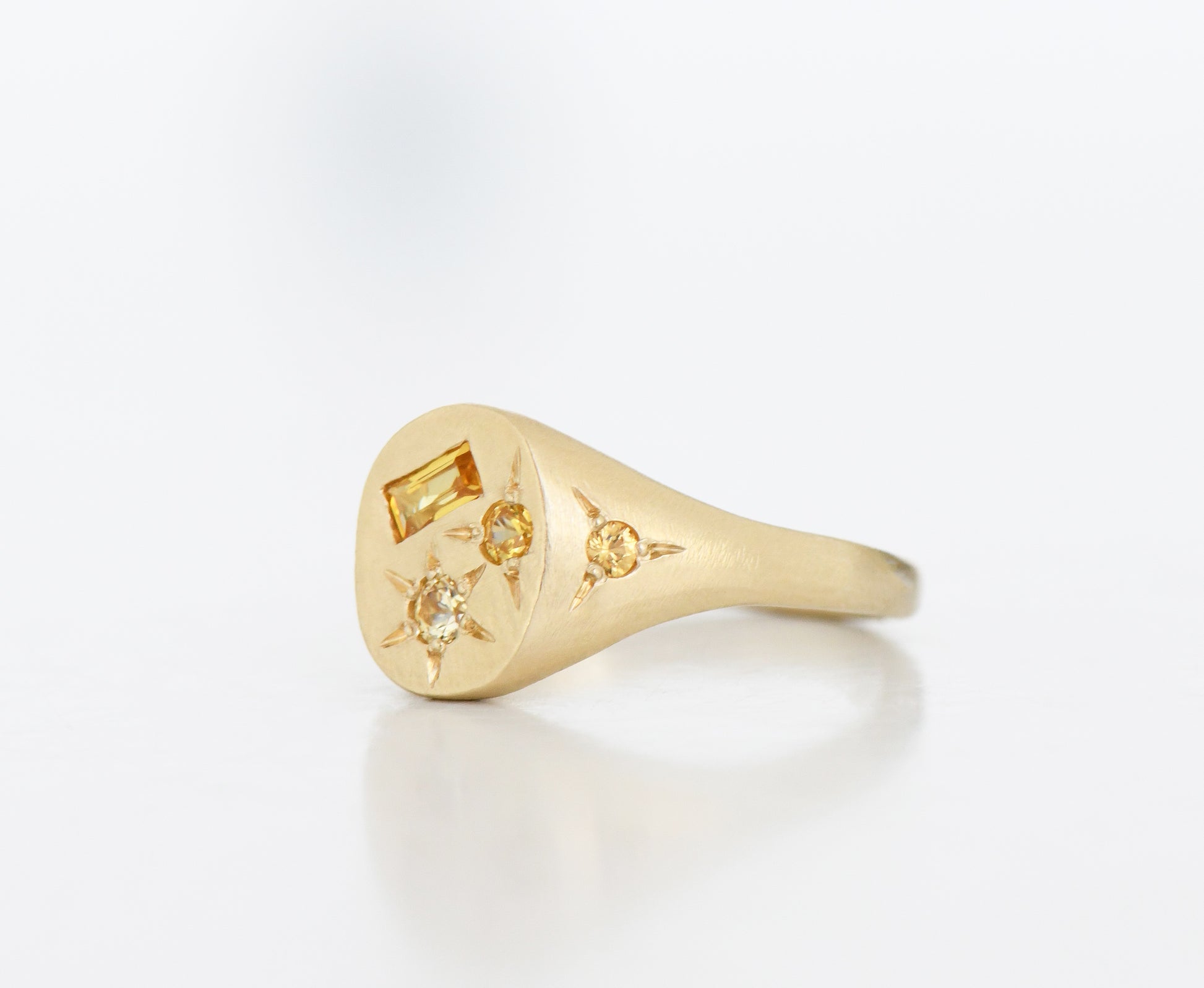 Yellow gold ring set with yellow sapphires. Monotone version of our classic signet style, tapered band, SB hallmarking at rear.