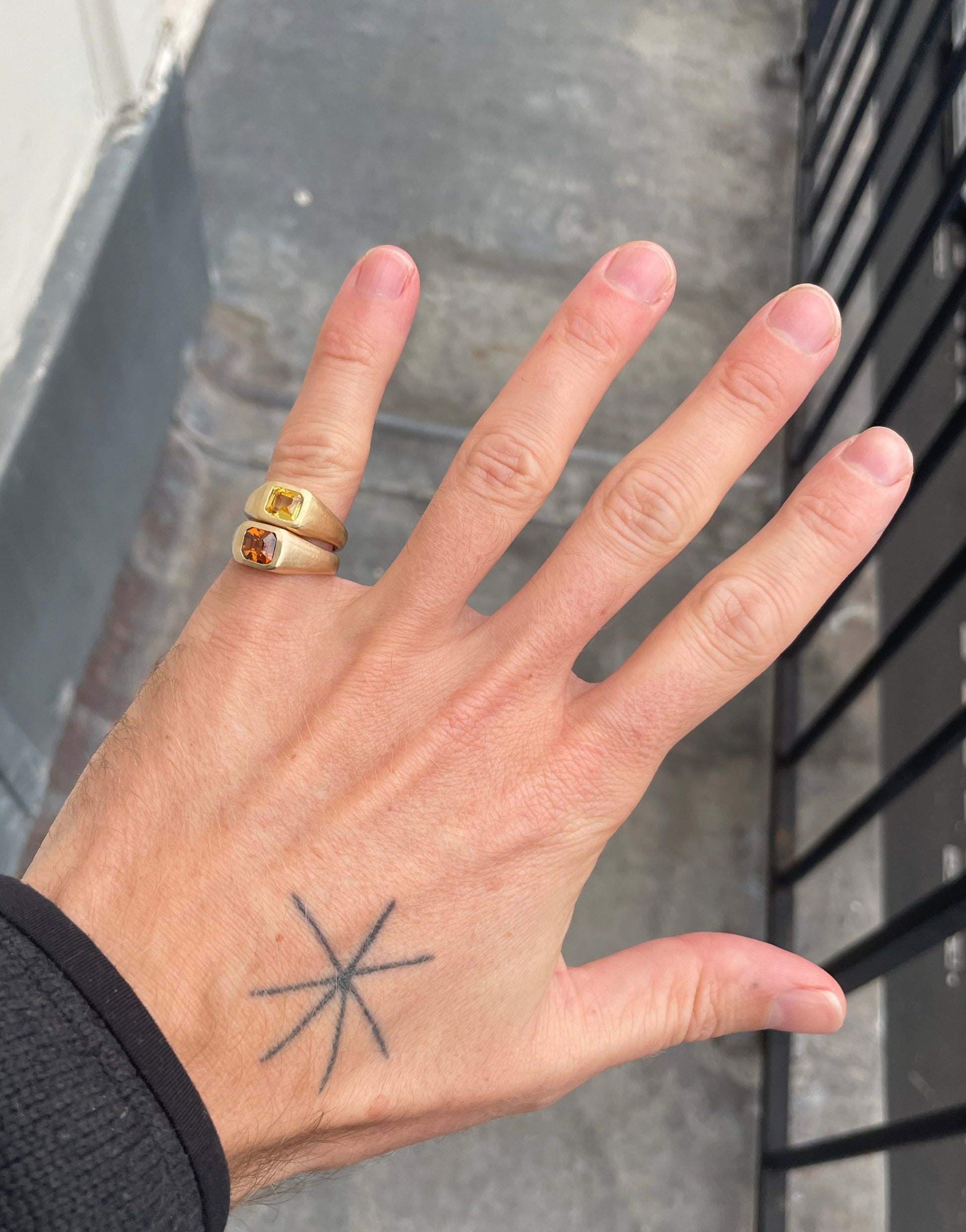 Asscher cut yellow sapphire set in 18ct yellow gold. Tapered shoulder and thick flat band, SB hallmarking at rear. This piece is a one-off and cannot be replicated. Re-size within 1-2 sizes.